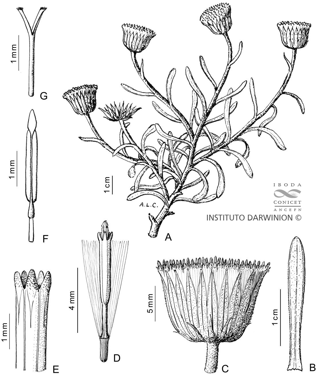A. Rama florífera. B. Hoja. C. Capítulo. D. Flor. E. Ápice de la corola. F. Estambre. G. Porción superior del estilo.