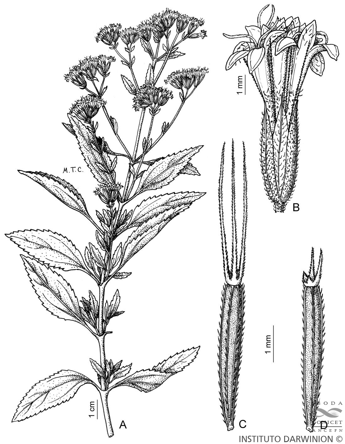 Hierbas perennes de 1-1,5 m de alto, con tallos ramosos, pubescentes. Hojas anchamente lanceoladas, agudas, atenuadas en la base en pecíolo alado cuneiforme, aserradas, con pubescencia laxa en la haz y densa sobre las nervaduras en el envés, de 4-8 × 2-3 cm. Capítulos sésiles o brevísimamente pedunculados, dispuestos en glomérulos en cimas corimbiformes terminales. Involucro ca. 5 mm de alto; filarios pubescentes en el dorso. Flores con corolas rosadas (blancas). Papus dimorfo formado por varias escamas cortas y 1-3 aristas largas en los adelfocarpos y sólo por escamas y dos aristas cortas en los idiocarpos.