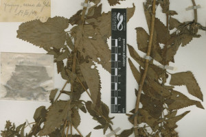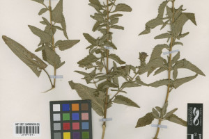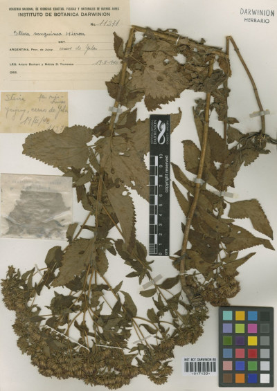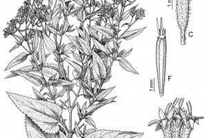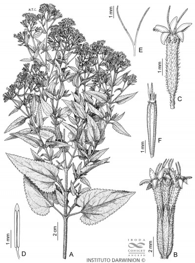 Hierbas perennes hasta de 1 m de alto, con tallos erectos muy ramificados en la parte superior, densamente pubescentes, con pelos blanquecinos curvos o algo crespos. Hojas cortamente pecioladas, ovadas o las inferiores ovado-lanceoladas, de 5-9 × 3-4 cm, truncadas o acorazonadas en la base, agudas en el ápice, uniformemente aserradas, más o menos pubescentes en ambas caras. Capítulos brevemente pedunculados, dispuestos en cimas glomeriformes y formando en conjunto una panoja amplia. Involucro de 5,5-6,5 mm de alto; filarios agudos, con pelos curvos o más raramente con pelitos glandulares capitados. Flores con corolas rosadas o purpúreas con pelos glandulares y no glandulares entremezclados. Papus dimorfo, formado por una corona de pajitas cortas y 1-5 aristas muy cortas en los adelfocarpos y sólo por escamas en los idiocarpos.
