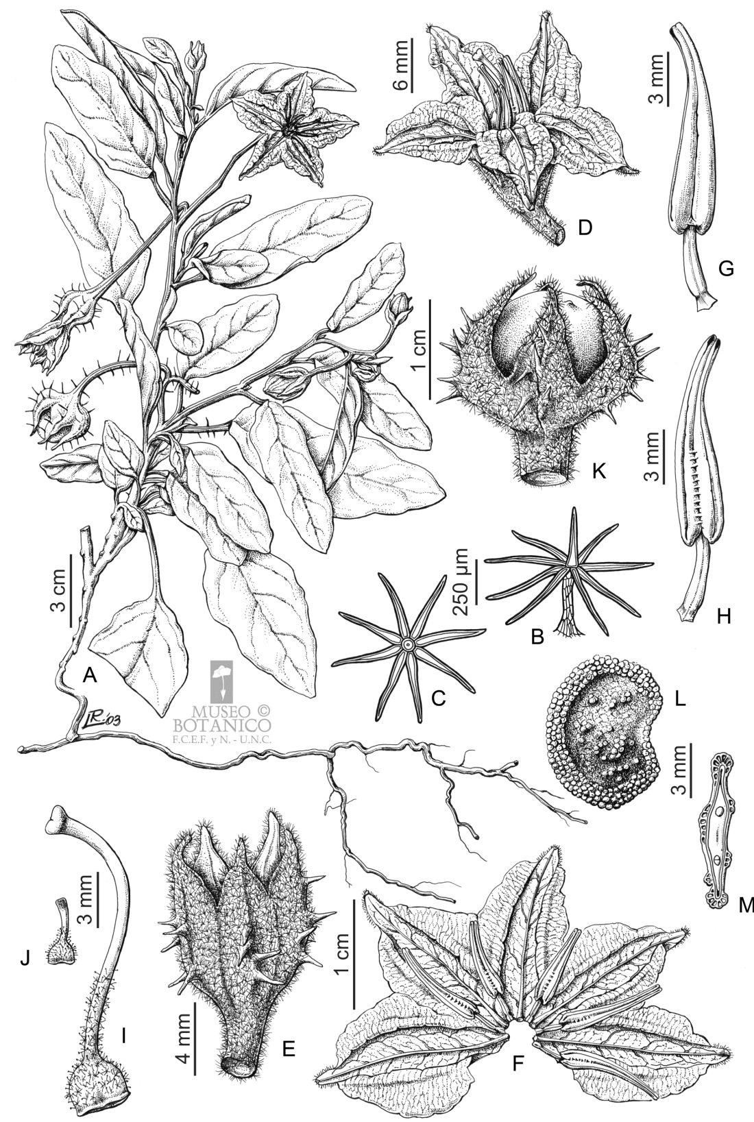 A. Planta. B. Tricoma estrellado del hipofilo, vista lateral C. Tricoma estrellado del hipofilo, vista de arriba. D. Flor longistilada. E. Cáliz. F. Corola desplegada. G. Estambre, vista dorsal. H. Estambre, vista ventral. I. Gineceo de flor longistilada. J. Gineceo de flor brevistilada. K. Fruto. L. Semilla. M. Semilla, corte transversal.