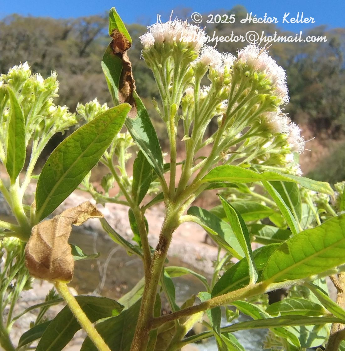 Arbustos o subarbustos ramosos, pubescentes, de 1-1,5 m de alto; tallos jóvenes densamente velludos y hojosos, glabrescentes y sin hojas a la madurez. Hojas alternas, brevemente pecioladas, con pecíolos de 2-10 mm de largo; láminas anchamente lanceoladas, de 5-13 × 1,5-4 cm, cuneiformes en la base, agudas en el ápice, enteras en el margen, velludas en ambas caras. Capítulos muy numerosos, cortamente pedunculados, con pedúnculos de 3-10 mm de largo, dispuestos en cimas corimbiformes terminales. Receptáculo glabro. Involucro acampanado, ca. 5 × 3 mm; filarios 3-4-seriados, los externos ovados, velludos en el dorso, los internos lineares, glabros. Flores con corola blanca, las del margen numerosas, pistiladas, con corola filiforme, ca. 4 mm de largo; las del centro 6-18, con corola tubulosa, de 3,5-5 mm de largo, 5-lobada, lóbulos de 0,4-0,5 mm de largo, papilosos, estilo con ramas cortas. Aquenios laxamente pubescentes con pelos dobles. Papus blanco, formado por cerdas escabrosas, casi tan largo como la corola.