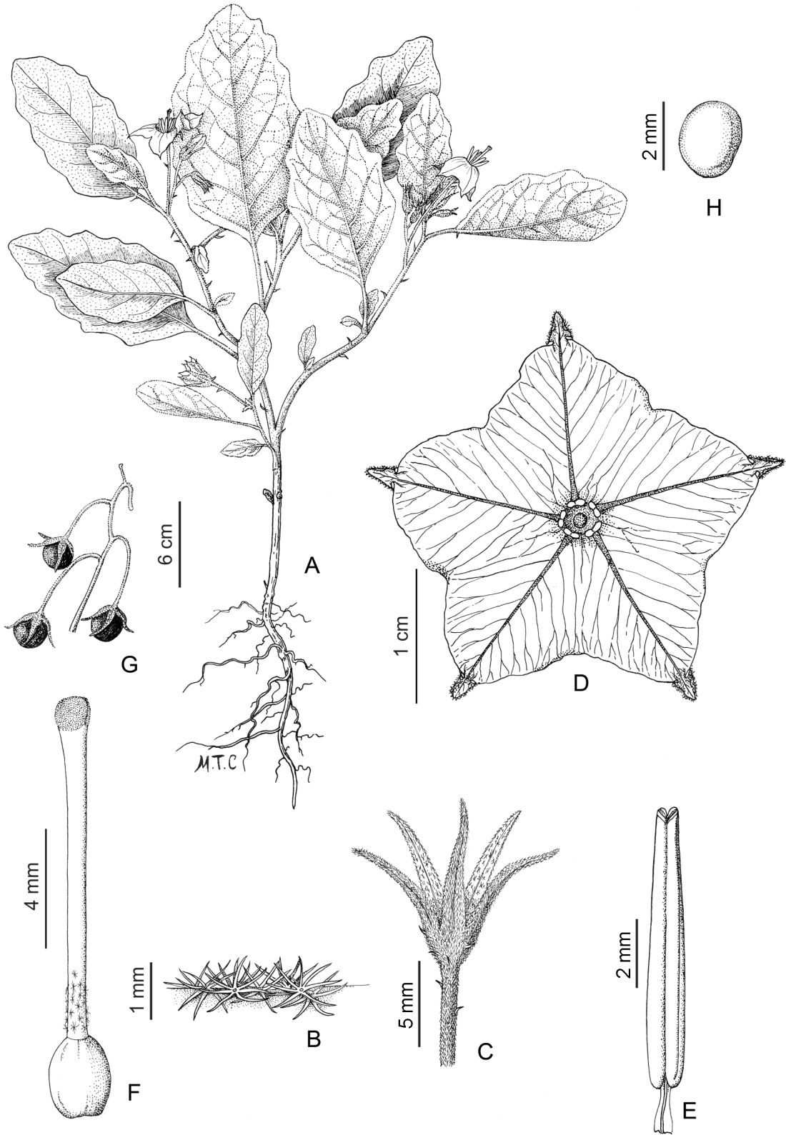 Hierbas perennes, hermafroditas, hasta de 50 cm de alto, con raíces gemíferas y tuberosas; tallos con algunos acúleos aciculares hasta inermes y con tricomas estrellados sésiles. Hojas pecioladas; láminas ovadas o elípticas, enteras, apenas sinuadas o con 3-6 pares de lóbulos redondeados, algo discoloras, inermes o con 7(-30) acúleos aciculares menores de 3 mm; epifilo con tricomas estrellados sésiles, con 4-6-8 rayos laterales y un rayo central; hipofilo con pubescencia más densa que en el epifilo, con tricomas estrellados, sésiles o cortamente estipitados, con 4-6-8 rayos laterales y un rayo central. Inflorescencia estrellados muy esparcidos, caducos a la madurez; hipofilo con un denso tomento blanquecino que cubre completamente la epidermis, formado por tricomas estrellados como los de los tallos pero con pie más largo. Inflorescencia pedunculada, ramificada, con unas (10-)50(-80) flores. Cáliz inerme, ca. 5 mm, lóbulos cortos y ovados; corola rotácea, blanca, de (26-)36(-44) mm de diámetro; anteras amarillas, iguales, de (7-)9(-13) mm. Baya globosa, ca. 1,3 cm de diámetro, de color verde oscuro o negruzco, con diminutos tricomas adpresos, caducos a la madurez; semillas ca. 220 por fruto, lenticulares, ca. 2 mm, lisas o finamente reticuladas, amarillas.