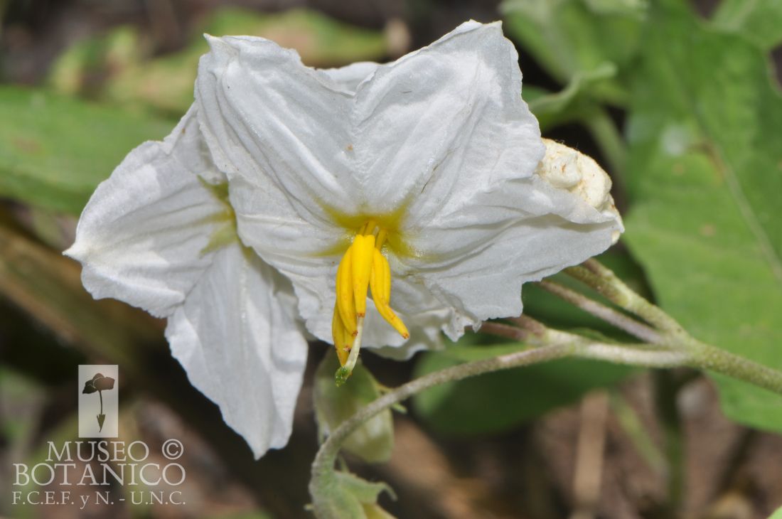 Hierbas perennes, hermafroditas, hasta de 50 cm de alto, con raíces gemíferas y tuberosas; tallos con algunos acúleos aciculares hasta inermes y con tricomas estrellados sésiles. Hojas pecioladas; láminas ovadas o elípticas, enteras, apenas sinuadas o con 3-6 pares de lóbulos redondeados, algo discoloras, inermes o con 7(-30) acúleos aciculares menores de 3 mm; epifilo con tricomas estrellados sésiles, con 4-6-8 rayos laterales y un rayo central; hipofilo con pubescencia más densa que en el epifilo, con tricomas estrellados, sésiles o cortamente estipitados, con 4-6-8 rayos laterales y un rayo central. Inflorescencia estrellados muy esparcidos, caducos a la madurez; hipofilo con un denso tomento blanquecino que cubre completamente la epidermis, formado por tricomas estrellados como los de los tallos pero con pie más largo. Inflorescencia pedunculada, ramificada, con unas (10-)50(-80) flores. Cáliz inerme, ca. 5 mm, lóbulos cortos y ovados; corola rotácea, blanca, de (26-)36(-44) mm de diámetro; anteras amarillas, iguales, de (7-)9(-13) mm. Baya globosa, ca. 1,3 cm de diámetro, de color verde oscuro o negruzco, con diminutos tricomas adpresos, caducos a la madurez; semillas ca. 220 por fruto, lenticulares, ca. 2 mm, lisas o finamente reticuladas, amarillas.
