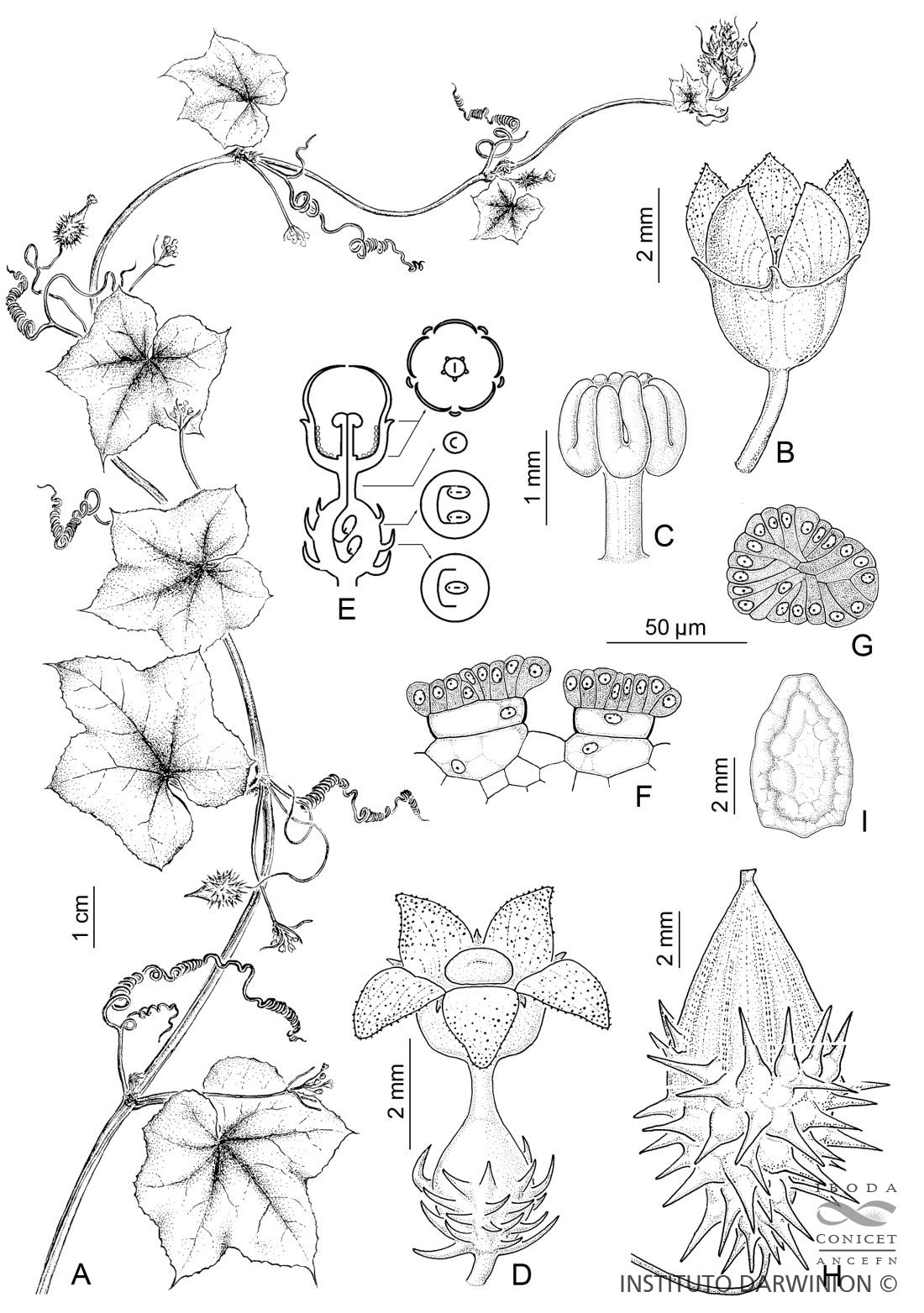 Terófitos zarcillosos, con tallos delicados de pocos decímetros de largo. Hojas simples; pecíolos de 20-55 mm de largo; lámina 5- angulada a 5-palmatilobada, de 30-60 × 30-50 mm. Zarcillos 2-fidos con vernación recta. Flores estaminadas 8-15, en monocasios racemiformes; pedúnculo de 18-50 mm de largo; pedicelos de 3-8 mm de largo; hipanto cupuliforme, de 1,5 × 1,8 mm, base cubierta con tricomas secretores nectarígenos; cáliz con prefloración abierta, sépalos dentiformes, ca. 0.1 mm de largo; corola valvada, petalos deltoides, de 1-1,2 × 1-1,2 mm, blancos, margen con tricomas 1-seriados, cara adaxial con papilas y pelos glandulares; androceo con columna hueca de 0,8-1 mm de largo, y sinatéreo de 0,7 × 0,6 mm, con 5 tecas en «U». Flores carpeladas solitarias; pedicelos de 4-8 mm de largo; hipanto cupuliforme, ca. 1,1 × 1,8 mm; nectario, cáliz y corola similares a los de la flor estaminada; ovario equinado en su mitad basal, de 3 × 1,5 mm, con cuello de 0,8 mm de largo; rudimentos seminales 2-3, ascendentes; estilo de 0,7-1 mm de largo, con 5 staminodios papiliformes, de 0,1-0,15 mm de largo, alrededor de su base; estigma hemisférico, ca. 0,8 mm de ancho. Frutos turbinado-ovoideos, de 15 × 6 mm, glabros, echinados en su mitad basal, espinas más o menos tuberculadas, hasta de 3 mm de largo; pedúnculos filiformes, de 25-40 mm de largo. Semillas 2-3, comprimidas, de 5 × 3,5-4 mm, subtuberculadas, margen engrosado.