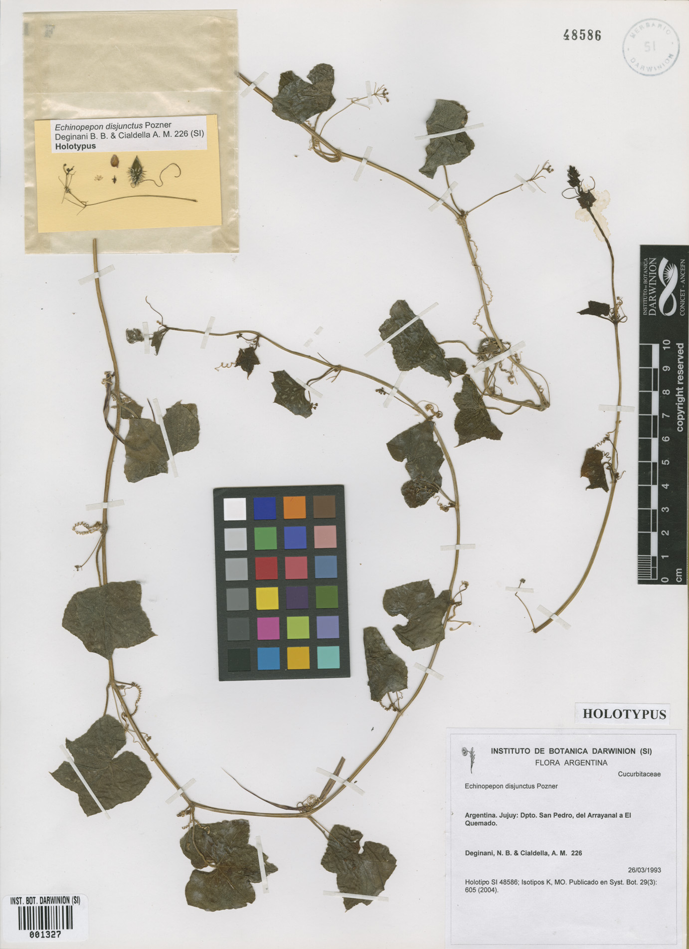 Terófitos zarcillosos, con tallos delicados de pocos decímetros de largo. Hojas simples; pecíolos de 20-55 mm de largo; lámina 5- angulada a 5-palmatilobada, de 30-60 × 30-50 mm. Zarcillos 2-fidos con vernación recta. Flores estaminadas 8-15, en monocasios racemiformes; pedúnculo de 18-50 mm de largo; pedicelos de 3-8 mm de largo; hipanto cupuliforme, de 1,5 × 1,8 mm, base cubierta con tricomas secretores nectarígenos; cáliz con prefloración abierta, sépalos dentiformes, ca. 0.1 mm de largo; corola valvada, petalos deltoides, de 1-1,2 × 1-1,2 mm, blancos, margen con tricomas 1-seriados, cara adaxial con papilas y pelos glandulares; androceo con columna hueca de 0,8-1 mm de largo, y sinatéreo de 0,7 × 0,6 mm, con 5 tecas en «U». Flores carpeladas solitarias; pedicelos de 4-8 mm de largo; hipanto cupuliforme, ca. 1,1 × 1,8 mm; nectario, cáliz y corola similares a los de la flor estaminada; ovario equinado en su mitad basal, de 3 × 1,5 mm, con cuello de 0,8 mm de largo; rudimentos seminales 2-3, ascendentes; estilo de 0,7-1 mm de largo, con 5 staminodios papiliformes, de 0,1-0,15 mm de largo, alrededor de su base; estigma hemisférico, ca. 0,8 mm de ancho. Frutos turbinado-ovoideos, de 15 × 6 mm, glabros, echinados en su mitad basal, espinas más o menos tuberculadas, hasta de 3 mm de largo; pedúnculos filiformes, de 25-40 mm de largo. Semillas 2-3, comprimidas, de 5 × 3,5-4 mm, subtuberculadas, margen engrosado.