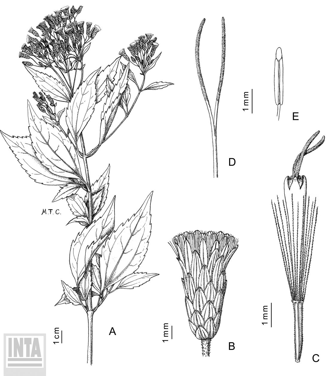 A. Rama florífera. B. Capítulo. C. Flor. D. Parte superior del estilo. E. Estambre.