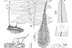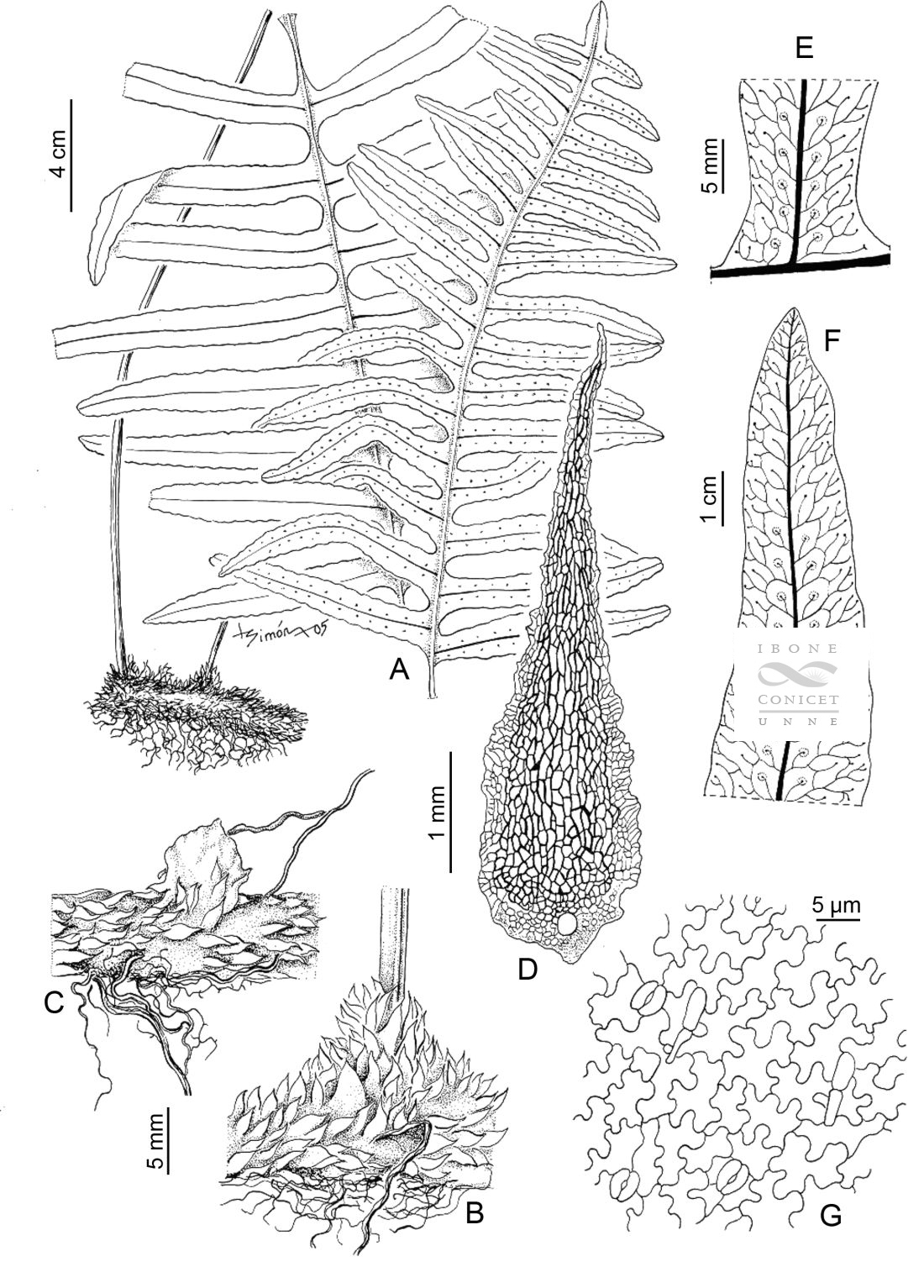A. Planta. B-C. Rizoma densa y laxamente cubierto de escamas, respectivamente. D. Escama rizomática. E. Porción basal de una pinna mostrando la venación. F. Porción apical de una pinna mostrando la venación. G. Detalle de la epidermis, se observan tricomas bicelulares.