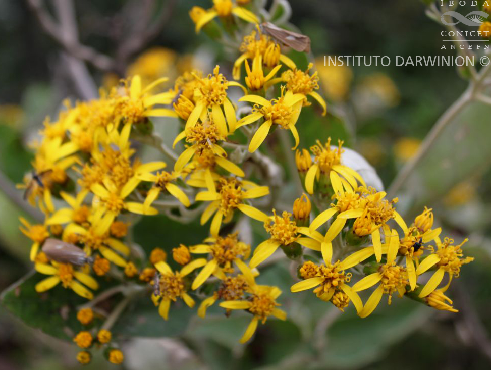 Arbustos densamente tomentosos, de 1,5-2 m de alto, con tallos hojosos hasta la inflorescencia. Hojas alternas, pecioladas, con pecíolos acanalados; láminas ovado-elípticas, de 8-11 × 3,5- 4,5 cm, redondeadas o subcordadas en la base, redondeadas y mucronadas en el ápice, irregulamente dentadas en el margen, con 4-5 dientes a cada lado, glabras y brillantes en la haz y densamente tomentosas en el envés. Capítulos radiados, numerosos, pedunculados, dispuestos en cimas corimbiformes pluricéfalas; pedúnculos de 5-25 mm de largo, densamente tomentosos. Involucro acampanado, de 7-9 × ca. 5 mm; brácteas del calículo pocas, lineares; filarios 8, oblongos, subagudos, glabros, 4 más anchos alternando con 4 más angostos. Flores dimorfas, con corolas amarillas, las del margen 5, con tubo ca. 5 mm de largo y lígula elíptica, ca. 5 × 2 mm, 3-dentada en el ápice; las del centro 12, corolas ca. 7 mm de largo, 5-lobadas; ramas del estilo con una coronita de pelos y en el centro un mechón más largo de pelos. Aquenios cilindroides, glabros. Papus formado por numerosos pelos rígidos, cortamente barbelados y desiguales en longitud, de color blancuzco.