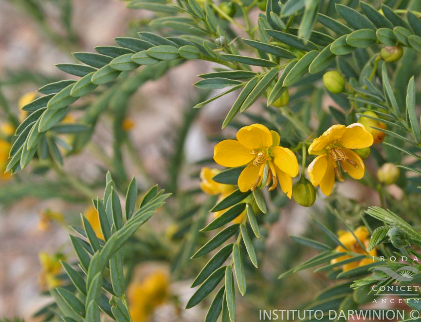 Arbustos 0,5-1.5 m de altura, con ramas subglabras a pilosas 2-5 mm de diámetro. Hojas paripinadas, 5-10 yugas, glabras, mucronuladas 1,4-3,2 cm long x 0,4-0,6 mm lat., folíolos.... ?, glándula raqueal estipitada, entre el primer y segundo par de folíolos. Racimos (4-)5-10-floros ; flores con el pétalo más interno oblongo y Cáliz ?, Corola... ?emarginado en el ápice ; androceo formado por tres grupos de estambres, el adaxial reducido a estaminodios, dehiscencia de las anteras fértiles centrales unipora, a veces con un septo terminal obsoleto ; gineceo 1-1,5 cm long., de márgenes profusamente pilosos con tricomas glandulares, 20-29-ovulado. Legumbre subcilíndrica, 4-12 cm long x 0,4 - 0,7 cm lat, con constricciones irregulares y valvas coriáceas, castaño oscuro. Semillas con sus caras más anchas oblicuas a las valvas del fruto, oblongas, 3,9 – 5,3 mm long. x 2,2 – 2,8 mm lat.