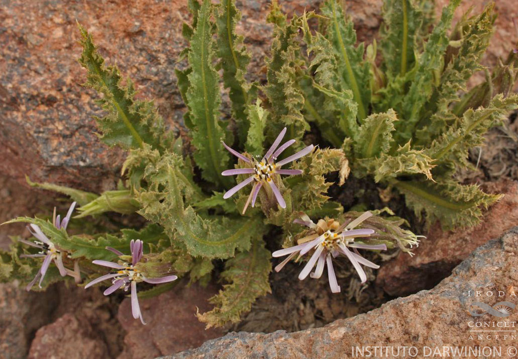 Hierbas caulescentes, de 7-40 cm de alto, densamente glanduloso-pubescentes. Hojas inferiores dispuestas en roseta, generalmente rodeadas por restos de pecíolos de hojas viejas y secas, largamente pecioladas, lanceoladas a oblanceoladas, de 3-12 × 0,5-3 cm, atenuadas en la base, agudas en el ápice, sinuadas, crenado-dentadas o pinnatisectas, margen crespo y retorcido, irregularmente denticulado, con cilias espiniformes, glanduloso-pubescentes o glabras en ambas caras; hojas superiores numerosas a escasas, ovado- u oblongo-lanceoladas. Capítulos solitarios o 2-20, formando una cima racemiforme laxa o densa y espiciforme. Involucro de (15-)20-40 × 10-20 mm; filarios 3-5-seriados, angostamente escariosos en el margen, glanduloso-pubescentes, los externos oblongo- u ovadolanceolados, enteros o espinuloso-ciliados en el margen, los internos lanceolados. Flores 20-60, corola azul, blanca, amarillenta, violácea, verdoso-violácea, lilacina, las del margen con tubo de 11-15 mm de largo, labio exterior de 6-10 mm de largo. Aquenios truncados en el ápice, seríceo-velludos, con tricomas blanquecinos o dorados. Papus de 15-20 mm de largo, leonado.
