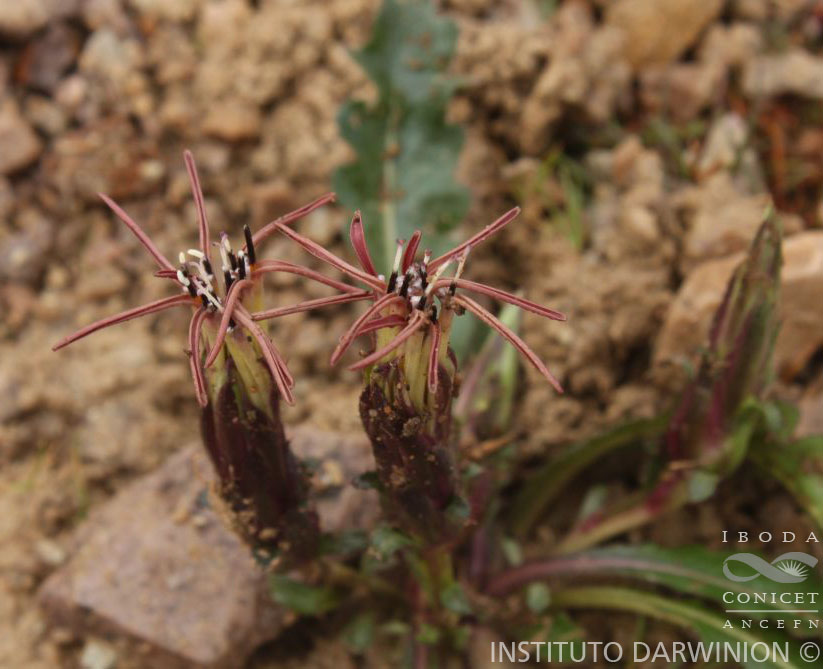 Hierbas caulescentes, de 7-40 cm de alto, densamente glanduloso-pubescentes. Hojas inferiores dispuestas en roseta, generalmente rodeadas por restos de pecíolos de hojas viejas y secas, largamente pecioladas, lanceoladas a oblanceoladas, de 3-12 × 0,5-3 cm, atenuadas en la base, agudas en el ápice, sinuadas, crenado-dentadas o pinnatisectas, margen crespo y retorcido, irregularmente denticulado, con cilias espiniformes, glanduloso-pubescentes o glabras en ambas caras; hojas superiores numerosas a escasas, ovado- u oblongo-lanceoladas. Capítulos solitarios o 2-20, formando una cima racemiforme laxa o densa y espiciforme. Involucro de (15-)20-40 × 10-20 mm; filarios 3-5-seriados, angostamente escariosos en el margen, glanduloso-pubescentes, los externos oblongo- u ovadolanceolados, enteros o espinuloso-ciliados en el margen, los internos lanceolados. Flores 20-60, corola azul, blanca, amarillenta, violácea, verdoso-violácea, lilacina, las del margen con tubo de 11-15 mm de largo, labio exterior de 6-10 mm de largo. Aquenios truncados en el ápice, seríceo-velludos, con tricomas blanquecinos o dorados. Papus de 15-20 mm de largo, leonado.