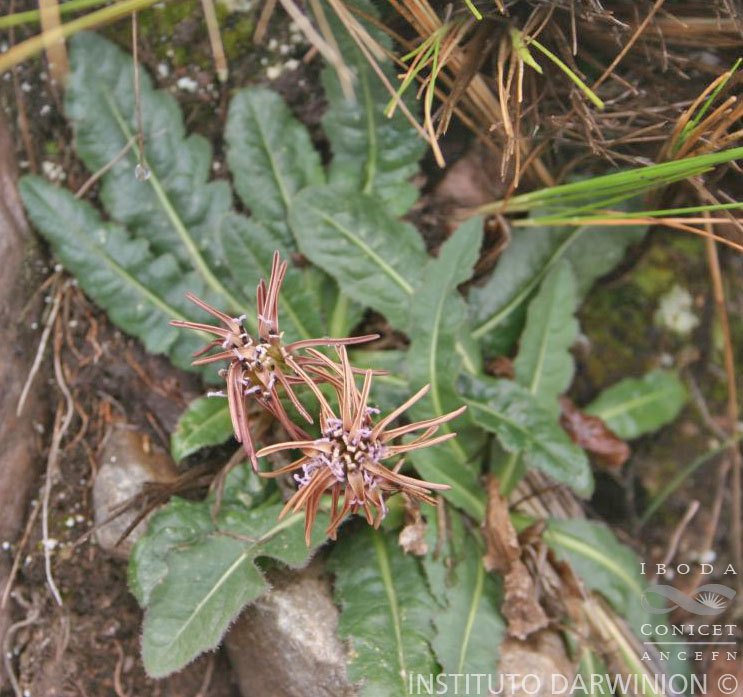 Hierbas caulescentes, de 7-40 cm de alto, densamente glanduloso-pubescentes. Hojas inferiores dispuestas en roseta, generalmente rodeadas por restos de pecíolos de hojas viejas y secas, largamente pecioladas, lanceoladas a oblanceoladas, de 3-12 × 0,5-3 cm, atenuadas en la base, agudas en el ápice, sinuadas, crenado-dentadas o pinnatisectas, margen crespo y retorcido, irregularmente denticulado, con cilias espiniformes, glanduloso-pubescentes o glabras en ambas caras; hojas superiores numerosas a escasas, ovado- u oblongo-lanceoladas. Capítulos solitarios o 2-20, formando una cima racemiforme laxa o densa y espiciforme. Involucro de (15-)20-40 × 10-20 mm; filarios 3-5-seriados, angostamente escariosos en el margen, glanduloso-pubescentes, los externos oblongo- u ovadolanceolados, enteros o espinuloso-ciliados en el margen, los internos lanceolados. Flores 20-60, corola azul, blanca, amarillenta, violácea, verdoso-violácea, lilacina, las del margen con tubo de 11-15 mm de largo, labio exterior de 6-10 mm de largo. Aquenios truncados en el ápice, seríceo-velludos, con tricomas blanquecinos o dorados. Papus de 15-20 mm de largo, leonado.