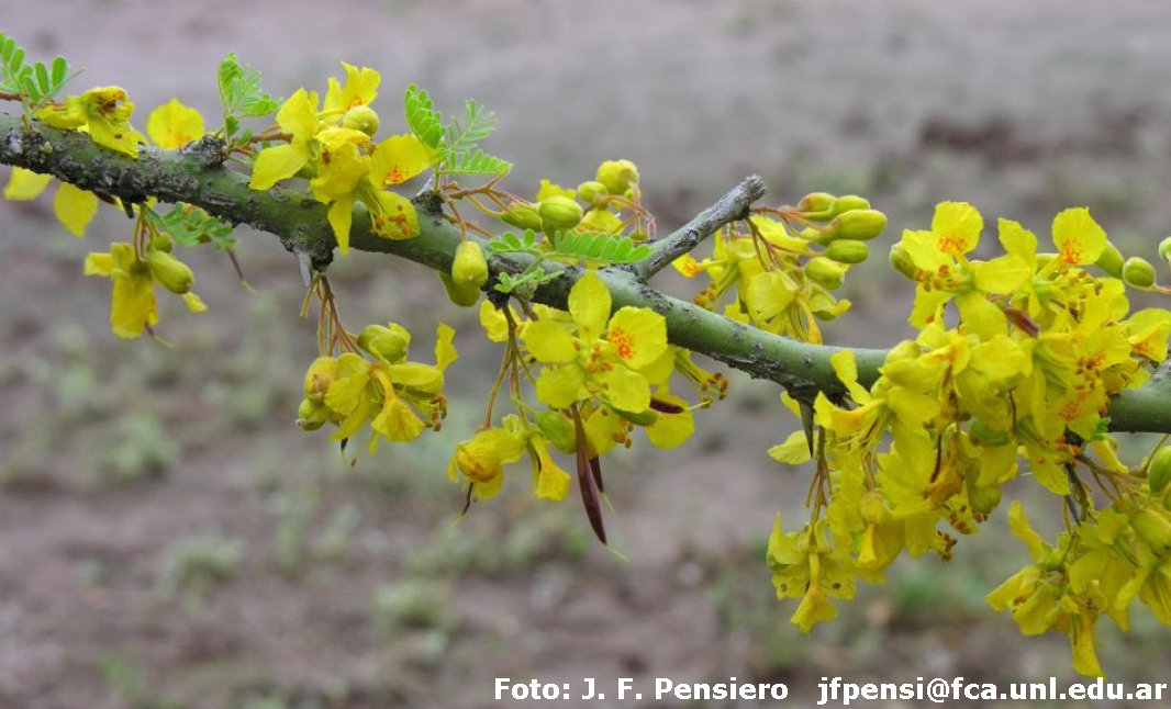 Arbustos o árboles, 2-6(-10) m alt.; corteza y ramas generalmente verde, lisa, brillante; ramas juveniles glabras o pubescentes; espinas axilares usualmente 1-2, por lo general desiguales, 3-15 mm long. Hojas (2-)5-12(-20) mm long., fecuentemente pilosas, alternas en ramas jóvenes, fasciculadas en braquiblastos en las adultas; estípulas deltoides, castaño-rojizas, 1-2 mm long., pubérulas; pinnas 1-2 pares, 9-15(-25) mm long., glabrescentes a pilosas; folíolos 5-8(-11) pares, oblongo-elípticos a subobovados, 5-8(-10) mm long.x 1,5-2(-3) mm lat., glabrescentes a pilosos. Racimos, 05-2 cm long.; flores 8-13 mm long., pedicelos, 4-10 mm long., articulados en su mitad, pubescentes o glabros, brácteas ovado-lanceoladas, 1-2 mm long., pubescentes, tempranamente caducas; hipanto, 1 mm long. x 1,5 –2 mm diám.; caliz de sépalos oblongo-deltoides, 6 mm long. x 2 mm lat., glabrescentes o pilosos; corola con el pétalo adaxial de 11 mm long. con uña angosta y pilosa en su interior, 5 mm long. lámina suborbicular, 6 mm long. x 7 mm lat., los restantes pétalos algo menores, 8-8,5 mm long., uña 2-2,5 mm log., lámina obovada, 6 mm long. x 4,5 mm lat.; androceo, 9-10 mm long.; ovario sésil, 4 mm long., glabro, 10-11-ovulado. Legumbre linear a largamente elíptica, (4-)7-9 (-10) cm long. x 0,8-1 cm lat., aguda, castaño-amarillentaa cobriza, glabra, 1-4- seminada. 2n= 28 (Bernardello & al. op. cit.: 150).