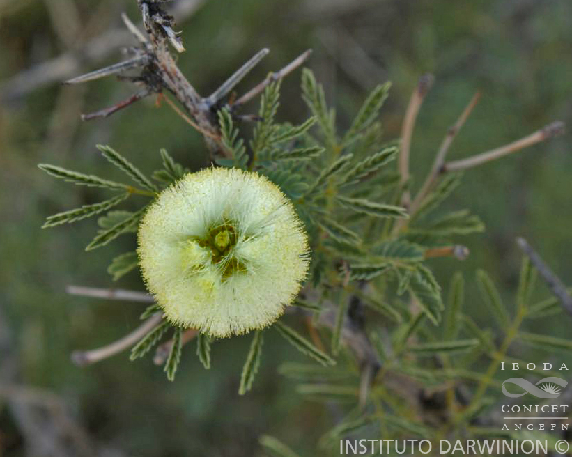 Arbol o arbusto 1,3-4 m alt., con ramas generalmente lisas y glabras, a veces ligeramente pubescentes hacia el ápice. Espinas axilares solitarias en general, 5-18 mm long., terminando en 2 aguijones infranodales de alrededor 2-3,5 mm long., más raramente dispersos, solitarios, más pequeños. Hojas 2-6 yugadas; pecíolo piloso, eglanduloso, rara vez con glándula sésil circular en la mitad de su longitud; raquis primario piloso, mucronulado, con pequeñas glándulas sésiles circulares, pubescentes, a la altura del último o de los últimos pares de raquis secundarios; folíolos 2-4 mm long. x 0,5-1 mm lat., agudos, aveces acuminados, con cara abaxial y bordes estrigosos, 8-20 pares por raquis secundario. Espigas capituliformes 1-1,5 cm diám., sobre pedúnculos pubescentes 1-3,5 cm long., agrupados en inflorescencias complejas racemosas. Flores amarillas o blanquecinas, sésiles; brácteas 1,5 mm long. x 0,5 mm lat., dorsalmente estrigosas; cáliz 2,5-4 mm long., 5-6 dentado, corola 3-5 mm long., 5-6 dentada, ambos ciclos glabros; estambres 6-10 mm long., con anteras eglandulosas o con glándula apical esférica, estipitada; ovario piloso en algunas zonas. Legumbre recta 5-11 cm long. x 1-3,5 cm lat., con extremo romo o mucronulado. Semillas 8-12 mm long. por 5-7 mm lat., 5-10 por fruto.