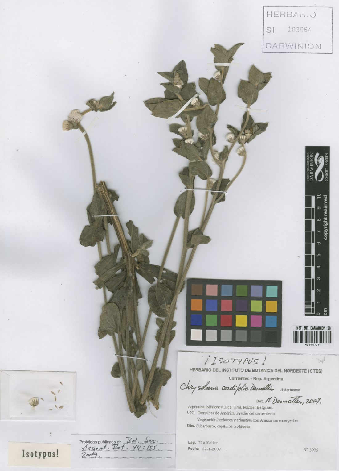 Observaciones: Se asemeja a Chrysolaena cognata, de la que puede diferenciarse claramente porque en ésta la base de las hojas es obtusa y las brácteas son reducidas, generalmente más cortas que el involucro. Chrysolaena cordifolia posee brácteas de la inflorescencia foliáceas, lo cual no es frecuente en el género y permite separarla de las restantes entidades.