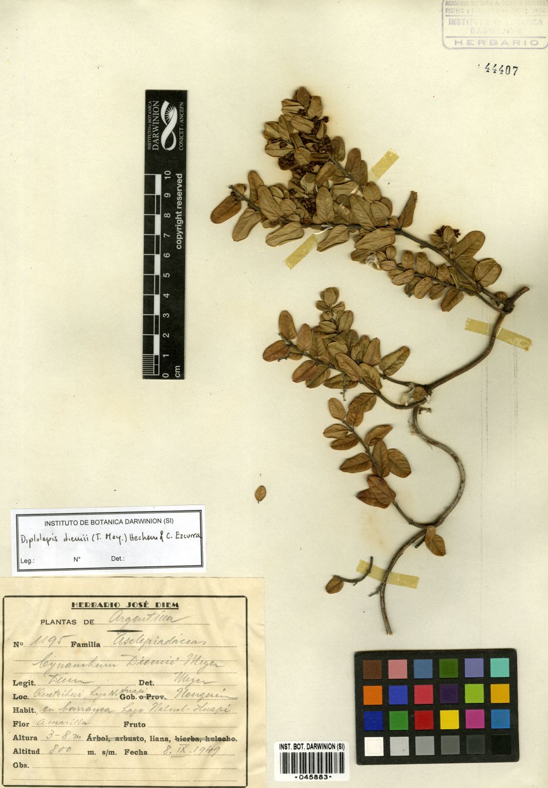 Observaciones: Nombre vulgar. “Voqui”. Observaciones. Florece en primavera. Las flores despiden un intenso aroma similar al de la vainilla. Diplolepis diemii se caracteriza por ser una enredadera de varios metros, con hojas oblongas a oblongo-lanceoladas de margen marcadamente revoluto, y flores amarillas con fuerte aroma a vainilla. Habita generalmente en bosques de coihue y se asemeja a D. pachyphylla y D. bulligera.