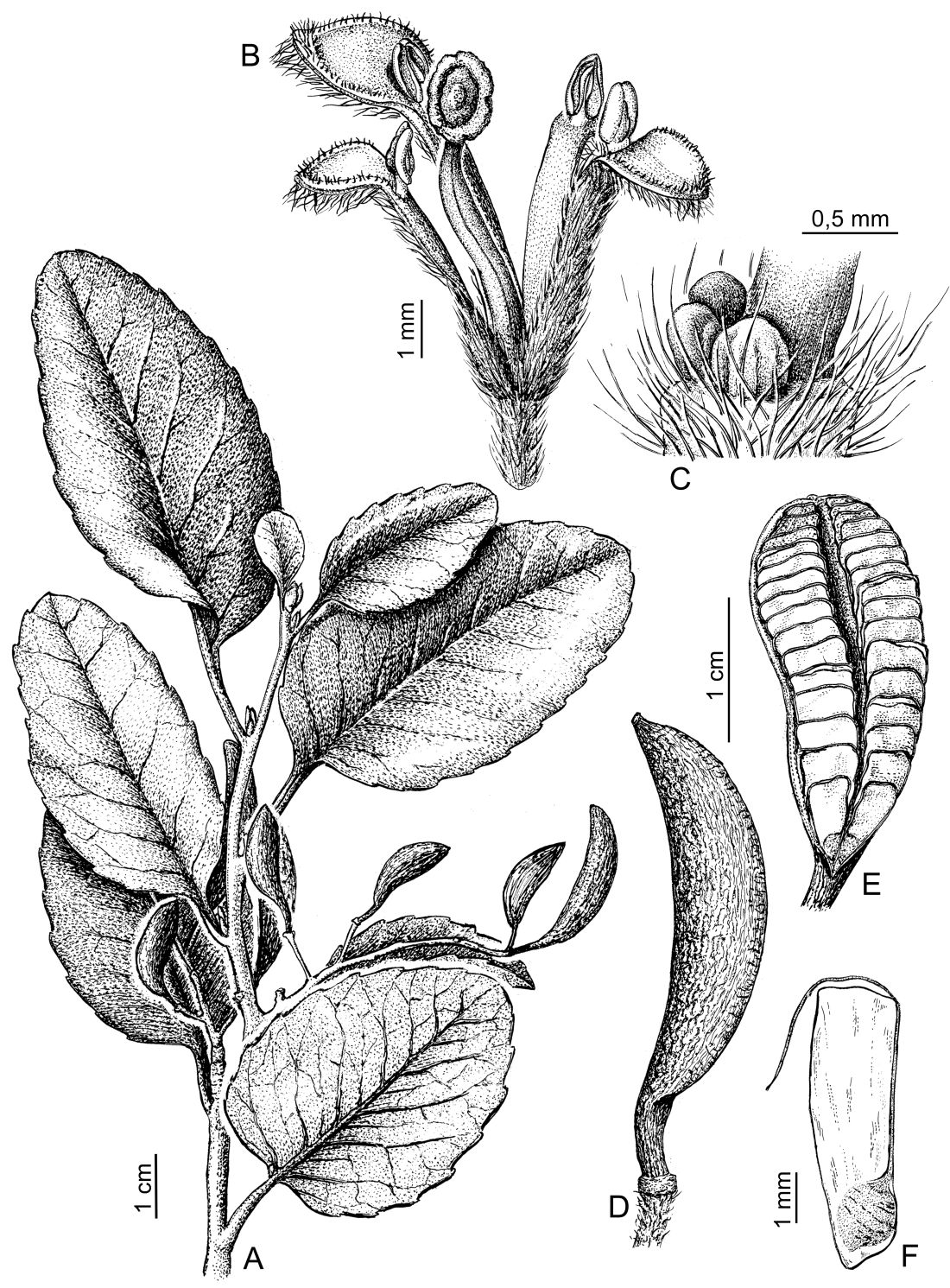 A. Rama fructífera. B. Flor luego de la antesis. C. Glándulas nectaríferas en la base del ovario. D. Fruto inmaduro. E. Fruto abierto con semillas. F. Semilla.
