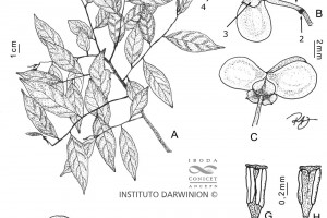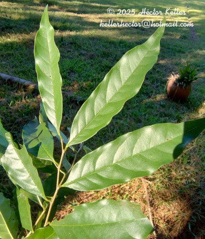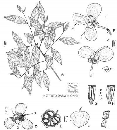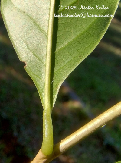 Árboles de 5-15 m de alto; ramas de 5-10 mm de diámetro, cuando jóvenes glabras a esparcidamente pubescentes; entrenudos de 0,5-3,2 cm de largo. Hojas con pecíolos de 0,3-1,7 cm de largo, pubescentes a glabros; láminas generalmente obovado-lanceoladas, oblongo-lanceoladas o estrechamente elípticas, de 8,5-23 × 1,8-6,7 cm, de base aguda, ápice, en general, agudo-acuminado o agudo-caudado, bordes conspicuamente revolutos, de color negro o castaño y con brillo metálico cuando secas, glabras; agallas cupuliformes, más anchas que altas, frecuentemente presentes en el epifilo, con 6-12 pares de venas secundarias. Inflorescencias en ripidios de 2,5-16 mm de largo × 0,5-0,8 mm de diámetro basal y de 1-2,5 mm de diámetro apical, opositifolias o extraaxilares, con 1-3 flores; pedicelos glabros a esparcidamente pubescentes; bractéolas deltoides, de 1 × 0,8 mm. Flores amarillas; cáliz con 3 sépalos libres, conspicuamente carenados, deltoides, de 2,5-3 × 2-3 mm, de ápice agudoacuminado, base truncada, externamente pubescentes, internamente glabros; corola compuesta por 6 pétalos, connados en la base, formando un tubo basal corto, de 2,5-5 mm de diámetro, externamente esparcida a densamente pubescentes e internamente glabros, carnosos, dispuestos en 2 verticilos, el verticilo externo compuesto por pétalos con proyecciones aliformes elípticas, obovado-orbiculares a ovaladas, patentes, ascendentes o inclinadas hacia abajo, comprimidas longitudinalmente, de 5-7 mm de largo × 3,5-5 mm de altura en su parte más ancha y de 0,5-2 mm de espesor en la base, el verticilo interno con pétalos reducidos, de 1,5-2,5 mm de alto × 2-3 mm de ancho en la parte libre y de 0,5-2 mm de alto × 1-2,8 mm de ancho en la parte connada, densamente pubescentes en la cara externa, internamente glabros; androceo compuesto por 130-150 estambres de disposición espiralada alrededor del eje floral, de 0,8-1 mm de largo, anteras de 0,7-0,8 mm de largo; gineceo con ca. 70 carpelos libres, glabros, con estigmas capitados conniventes. Frutos globosos, de 2-3,5 cm de alto × 2,8-3,7 cm de ancho, cayendo de las ramas cuando maduros, glabros, sobre pedúnculos de 0,4- 1,8 cm de largo × 1,2-2,5 cm de diámetro, epicarpio generalmente con la superficie lisa o con leves excrecencias convexas, a veces, con arrugas longitudinales, verde oscuros cuando jóvenes, verde claros o amarillentos al madurar, pero sin areolas prominentes, hexagonales o pentagonales. Semillas cuneiformes, de 9-14 × 4-8 mm, castañas a negras, sarcotesta lechosa y ácida en el fruto fresco.