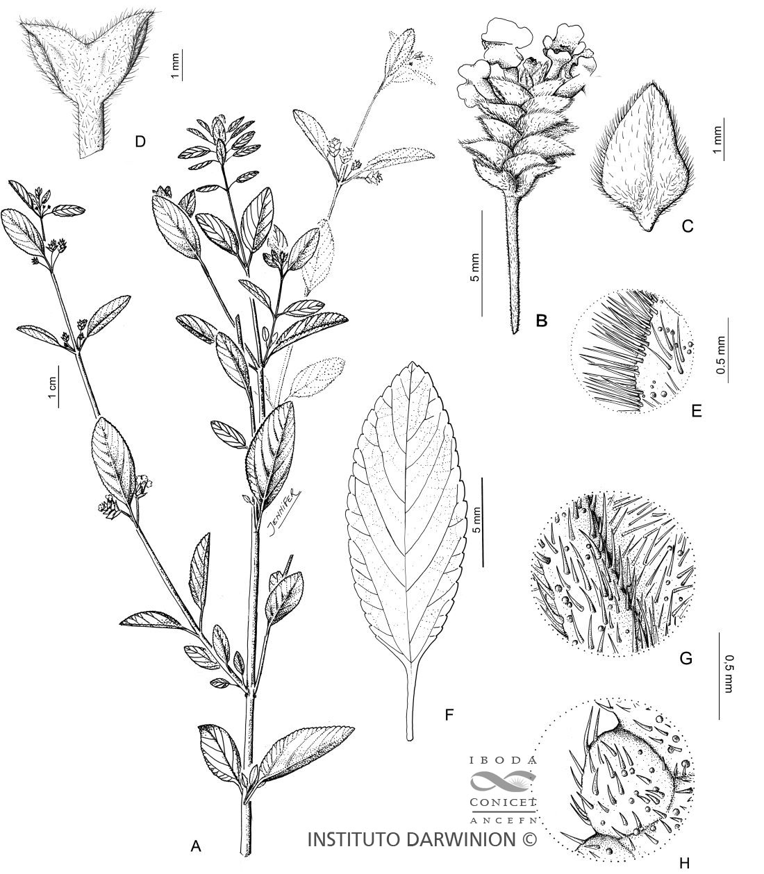 A. Rama. B. Florescencia parcial. C. Bráctea basal. D. Cáliz. E. Bráctea, detalle de la pubescencia. F. Hoja. G. Hoja, detalle de la pubescencia de la cara abaxial. H. Hoja, detalle de la pubescencia de la cara adaxial.