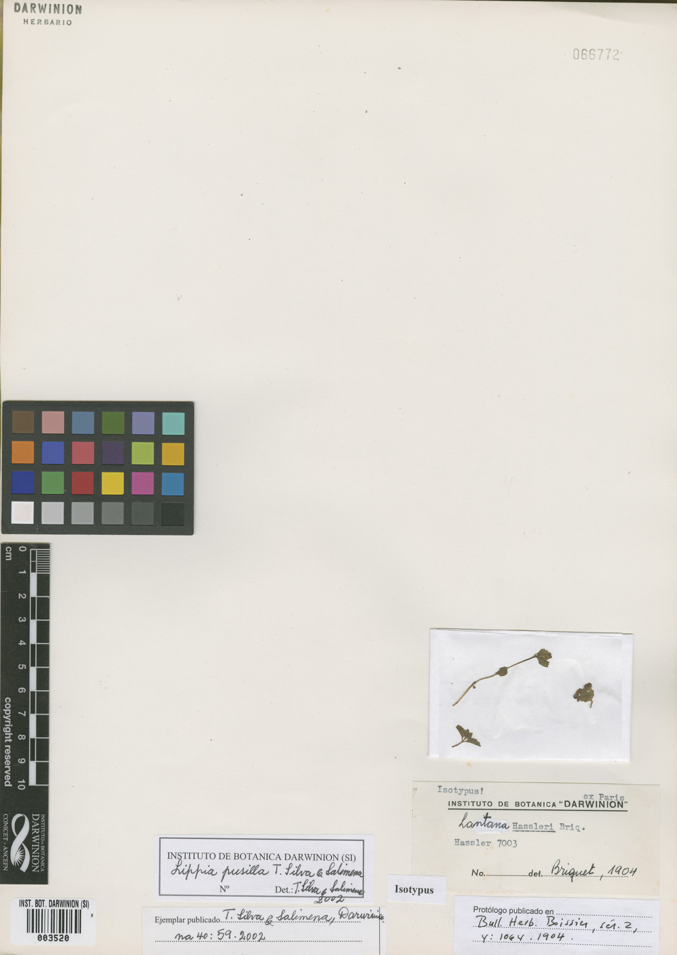 Sufrútices de 10-15 cm de alto; tallo subterráneo engrosado y leñoso; ramas herbáceas, procumbentes, estrigosas; entrenudos ca. 3 cm de largo. Hojas de 6-10 x 5-10 mm, ovadas o suborbiculares, base cuneada, ápice obtuso o redondeado, margen regularmente crenado, cara adaxial bullada, tomentosovelutina a hirtela, con numerosos pelos glandulares, cara abaxial areolada, tomentosa, con pelos blancos. Sinflorescencias en pleiobotrios homotéticos frondosos; florescencias parciales en espigas globosas, congestas, 1 por axila, de 2-6 x 3-5 mm, con pedúnculos ca. 5 cm de largo; brácteas lilas, rosadas o purpúreas, ca. 10 x 7 mm, ovadas, base obtusa a cordiforme, ápice agudo o acuminado, pubescentes, margen ciliado. Cáliz ca. 2 x 2 mm, 2-fido, hirsutísimo, densamente glanduloso externamente, persistente en el fruto; corola rosada, hipocraterimorfa, tubo de 8-10 mm de largo, curvo, ventricoso, externamente glandularvilloso excepto en la base, internamente esparcidamente pubescente. Fruto obovoide, ca. 3 mm de largo, caras comisural y convexa lisas, frecuentemente un carpelo abortado.