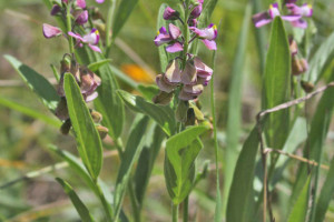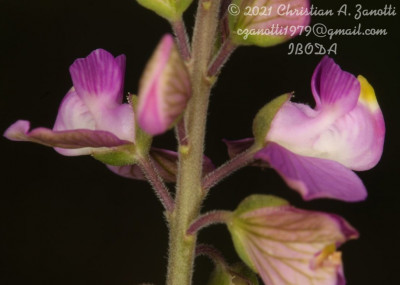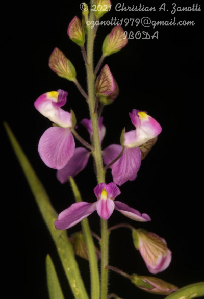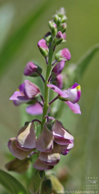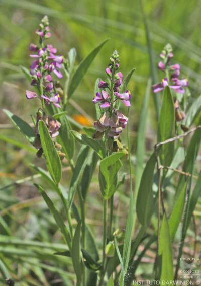 Hierbas de 12-50 cm de alto, erectas hasta subdecumbentes; tallos cilíndricos, simples o ramosos desde la base o sólo en su porción superior, pubérulos a pubescentes con tricomas cortos y curvos. Hojas alternas; pecíolos de 1-2(-4) mm de largo; láminas lineares, linear-oblongas, linear-lanceoladas, o elípticas, de 1,5-7,6 × 0,2-1,7(-2) cm, pubescentes. Inflorescencias en racimos laxos terminales o extraaxilares, de 5-20(-32,5) × 1-2 cm; brácteas ovadas a triangular-subuladas, de 1,6-3 × 0,3-0,5 mm, pubescentes, ápice agudo a acuminado, caducas en la antesis. Flores de 5-7 mm de largo; pedicelos de (1,9-)2,5-4 mm de largo, pubescentes; sépalos externos verdosos, pubescentes, con tricomas glandulosos o simples en sus márgenes; sépalo externo inferior lanceolado, ca. 3 × 1,3 mm, ápice agudo, cóncavo; sépalos externos superiores lanceolados, de 2,4-2,5 × 1-1,4 mm, fusionados en casi toda su extensión, ápice agudo; sépalos internos “alas” romboidales o suborbiculares, de 5,5-8 × 4-5 mm, brevemente unguiculados, ápice obtuso, plurinervados con nervaduras anastomosándose hacia los bordes, glabros, violáceos a blanquecinos; corola violácea; quilla de 5-5 mm de largo, cuña ca. 2 mm de largo, ápice amarillo, sin cresta, plegada lateralmente dándole el aspecto de ser 3-lobada; pétalos laterales ca. 4 × 1 mm, irregulares, dilatados en el ápice, con estrías violáceas en el ápice, pubescentes en la porción media adaxial, fusionados con la vaina estaminal; vaina estaminal ca. 3 mm de largo, glabra, porción libre de los fi lamentos estaminales mucho mayor que el largo de las anteras, ca. 2 mm de largo, anteras poricidas; ovario elipsoide, ca. 1-1,5 × 1-1,3 mm, glabro, apoyado sobre un breve soporte; estilo ca. 5 mm de largo, curvo, formando un ángulo de más o menos 90°, dilatado en la base, con un mechón de tricomas en su 1/4 apical, terminado en un pequeño estigma. Fruto una cápsula elipsoide, de 4-7 × 2,5-4 mm, emarginada, simétrica, cortamente estipitada, margen alado liso, glabra. Semillas cilíndricas, ca. 3-4,1 × 1,5-1,7 mm, pubescentes; elaiosoma apical comprimido lateralmente, de forma irregular.
