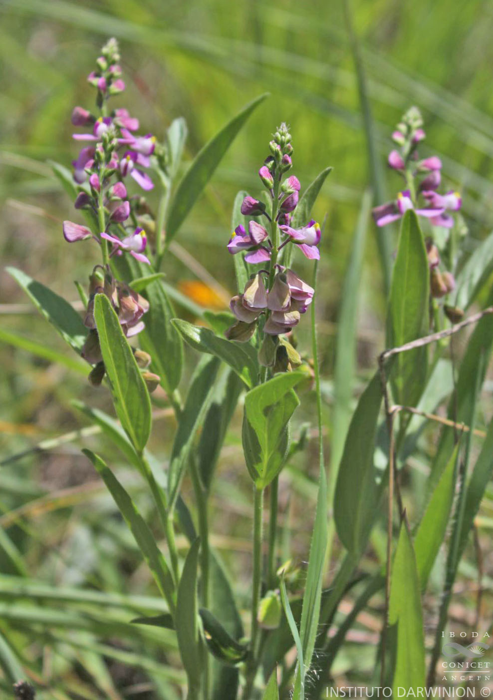 Hierbas de 12-50 cm de alto, erectas hasta subdecumbentes; tallos cilíndricos, simples o ramosos desde la base o sólo en su porción superior, pubérulos a pubescentes con tricomas cortos y curvos. Hojas alternas; pecíolos de 1-2(-4) mm de largo; láminas lineares, linear-oblongas, linear-lanceoladas, o elípticas, de 1,5-7,6 × 0,2-1,7(-2) cm, pubescentes. Inflorescencias en racimos laxos terminales o extraaxilares, de 5-20(-32,5) × 1-2 cm; brácteas ovadas a triangular-subuladas, de 1,6-3 × 0,3-0,5 mm, pubescentes, ápice agudo a acuminado, caducas en la antesis. Flores de 5-7 mm de largo; pedicelos de (1,9-)2,5-4 mm de largo, pubescentes; sépalos externos verdosos, pubescentes, con tricomas glandulosos o simples en sus márgenes; sépalo externo inferior lanceolado, ca. 3 × 1,3 mm, ápice agudo, cóncavo; sépalos externos superiores lanceolados, de 2,4-2,5 × 1-1,4 mm, fusionados en casi toda su extensión, ápice agudo; sépalos internos “alas” romboidales o suborbiculares, de 5,5-8 × 4-5 mm, brevemente unguiculados, ápice obtuso, plurinervados con nervaduras anastomosándose hacia los bordes, glabros, violáceos a blanquecinos; corola violácea; quilla de 5-5 mm de largo, cuña ca. 2 mm de largo, ápice amarillo, sin cresta, plegada lateralmente dándole el aspecto de ser 3-lobada; pétalos laterales ca. 4 × 1 mm, irregulares, dilatados en el ápice, con estrías violáceas en el ápice, pubescentes en la porción media adaxial, fusionados con la vaina estaminal; vaina estaminal ca. 3 mm de largo, glabra, porción libre de los fi lamentos estaminales mucho mayor que el largo de las anteras, ca. 2 mm de largo, anteras poricidas; ovario elipsoide, ca. 1-1,5 × 1-1,3 mm, glabro, apoyado sobre un breve soporte; estilo ca. 5 mm de largo, curvo, formando un ángulo de más o menos 90°, dilatado en la base, con un mechón de tricomas en su 1/4 apical, terminado en un pequeño estigma. Fruto una cápsula elipsoide, de 4-7 × 2,5-4 mm, emarginada, simétrica, cortamente estipitada, margen alado liso, glabra. Semillas cilíndricas, ca. 3-4,1 × 1,5-1,7 mm, pubescentes; elaiosoma apical comprimido lateralmente, de forma irregular.