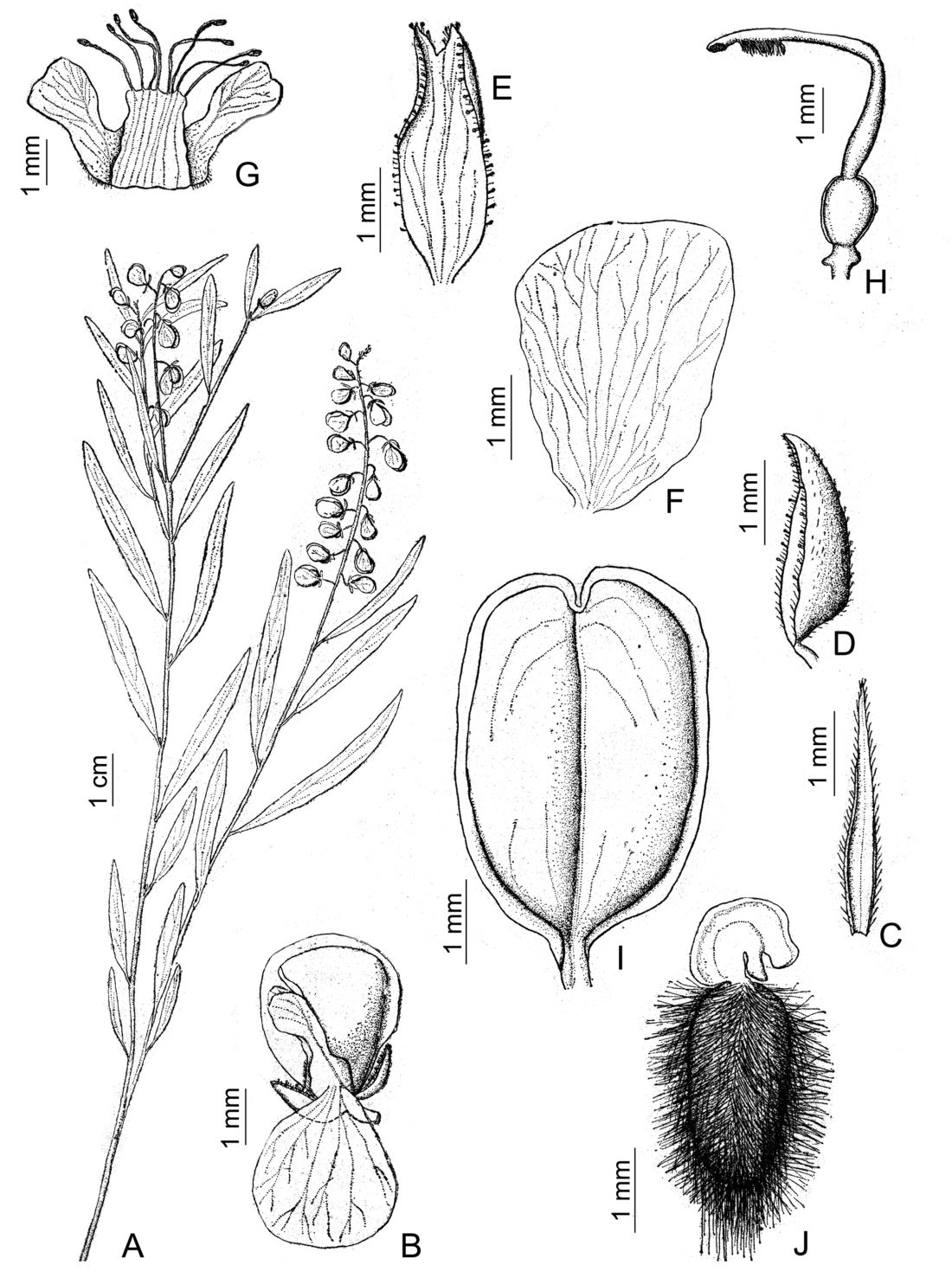 Hierbas de 12-50 cm de alto, erectas hasta subdecumbentes; tallos cilíndricos, simples o ramosos desde la base o sólo en su porción superior, pubérulos a pubescentes con tricomas cortos y curvos. Hojas alternas; pecíolos de 1-2(-4) mm de largo; láminas lineares, linear-oblongas, linear-lanceoladas, o elípticas, de 1,5-7,6 × 0,2-1,7(-2) cm, pubescentes. Inflorescencias en racimos laxos terminales o extraaxilares, de 5-20(-32,5) × 1-2 cm; brácteas ovadas a triangular-subuladas, de 1,6-3 × 0,3-0,5 mm, pubescentes, ápice agudo a acuminado, caducas en la antesis. Flores de 5-7 mm de largo; pedicelos de (1,9-)2,5-4 mm de largo, pubescentes; sépalos externos verdosos, pubescentes, con tricomas glandulosos o simples en sus márgenes; sépalo externo inferior lanceolado, ca. 3 × 1,3 mm, ápice agudo, cóncavo; sépalos externos superiores lanceolados, de 2,4-2,5 × 1-1,4 mm, fusionados en casi toda su extensión, ápice agudo; sépalos internos “alas” romboidales o suborbiculares, de 5,5-8 × 4-5 mm, brevemente unguiculados, ápice obtuso, plurinervados con nervaduras anastomosándose hacia los bordes, glabros, violáceos a blanquecinos; corola violácea; quilla de 5-5 mm de largo, cuña ca. 2 mm de largo, ápice amarillo, sin cresta, plegada lateralmente dándole el aspecto de ser 3-lobada; pétalos laterales ca. 4 × 1 mm, irregulares, dilatados en el ápice, con estrías violáceas en el ápice, pubescentes en la porción media adaxial, fusionados con la vaina estaminal; vaina estaminal ca. 3 mm de largo, glabra, porción libre de los fi lamentos estaminales mucho mayor que el largo de las anteras, ca. 2 mm de largo, anteras poricidas; ovario elipsoide, ca. 1-1,5 × 1-1,3 mm, glabro, apoyado sobre un breve soporte; estilo ca. 5 mm de largo, curvo, formando un ángulo de más o menos 90°, dilatado en la base, con un mechón de tricomas en su 1/4 apical, terminado en un pequeño estigma. Fruto una cápsula elipsoide, de 4-7 × 2,5-4 mm, emarginada, simétrica, cortamente estipitada, margen alado liso, glabra. Semillas cilíndricas, ca. 3-4,1 × 1,5-1,7 mm, pubescentes; elaiosoma apical comprimido lateralmente, de forma irregular.