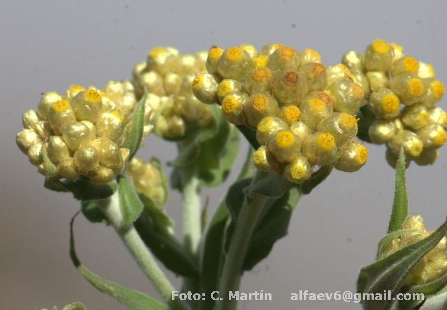 Hierbas probablemente perennes, de 20-100 cm de alto; tallos erectos, simples o algo ramificados en la parte superior, lanuginosos, hojosos hasta la inflorescencia. Hojas lanceoladas, de 6-9 × 1,5 cm, ensanchadas y decurrentes en la base, atenuadas y agudas en el ápice, discoloras, glabras o muy tenuemente lanosas en la haz y densamente albo-tomentosas en el envés. Capítulos numerosos dispuestos en glomérulos y reunidos en cimas corimbiformes amplias. Involucro acampanado, de 4 × 3-4 mm; filarios hialinos, amarillentos o parduscos, enteros en el margen, los exteriores ovados, de 3 × 2 mm, subagudos, los interiores oblongos, de 2,6 × 0,6 mm, desde agudos a redondeados en el ápice. Flores marginales, ca. 140, corolas de 1,8-2 mm de largo; flores del centro 10-20, corolas de 1,7-2 mm de largo. Aquenios de 0,5-0,6 mm de largo, glabros, epidermis lisa a menudamente papilosa. Papus de 2 mm de largo.