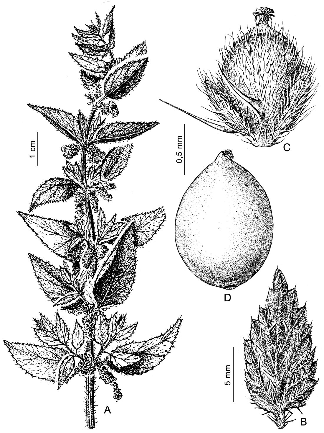 Sufrútices monoicos, raro andróginos, hasta de 2 m de alto; tallos erectos, 4-gonos, con tricomas urticantes. Hojas opuestas; pecíolo hasta de 1 cm de largo; lámina lanceolada, de 5-17 × 1-2 cm de largo, margen dentado, el diente apical acuminado, cara adaxial glabra o subglabra, con cistolitos, la abaxial con tricomas urticantes, principalmente sobre las nervaduras. Inflorescencias racemiformes, axilares, subtendidas por una bráctea foliosa. Flores estaminadas ca. 2 mm de diámetro. Flores pistiladas hasta de 2 mm de diámetro en fructificación. Aquenio ovoide, ca. 2 mm de largo.