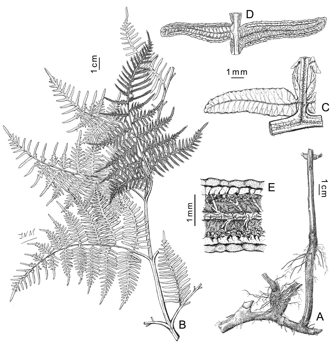A. Porción de rizoma y base del pecíolo. B. Porción apical de una fronde. C. Pínnula estéril mostrando la venación. D. Pínnula fértil. E. Detalle de una pínnula fértil, cara abaxial, mostrando el margen reflexo, indusio interno y esporangios.