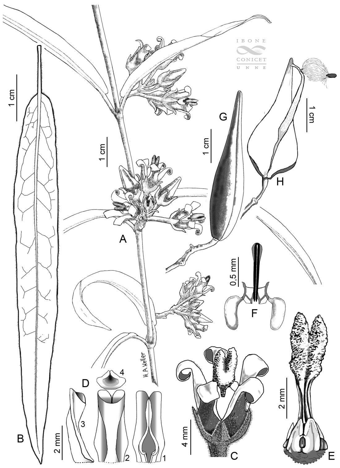 A. Rama florífera. B. Hoja. C. Flor. D. Corona. E. Ginostegio. F. Polinario. G. Fruto. H. Fruto luego de la dehiscencia. Tomado de Phytotaxa 184: 111. 2014.