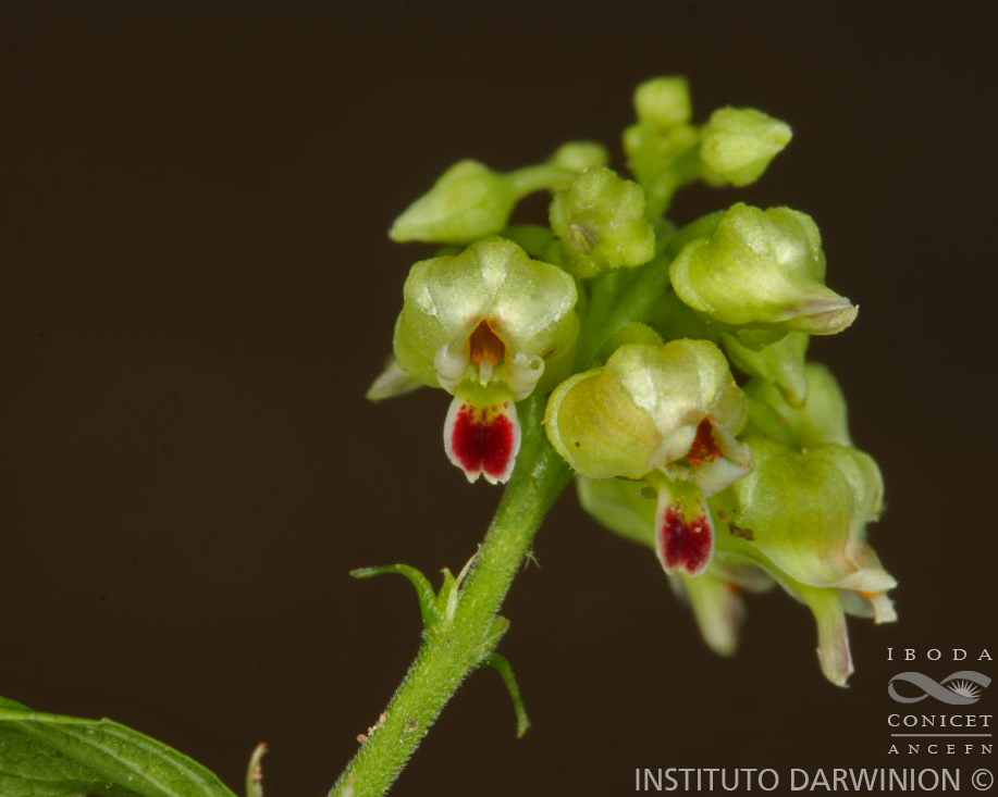 Arbustos a subarbustos de 0,5-2 m de alto; ramas glabras a pubescentes y frecuentemente lenticeladas. Hojas opuestas, membranáceas, glabras; pecíolos de 1,5-2 mm de largo; láminas lanceoladas, obovadas, ovadas a elípticas, de 3-14 × 1-6 cm, con base obtusa, ápice acuminado y margen crenado a serrado. Flores pequeñas, blancas a verdosas, con el labelo y el extremo de los pétalos laterales de color púrpura, carácter del cual deriva su nombre, dispuestas en pseudoracimos terminales; sépalos desiguales, lanceolados a ovales, de 2-3 mm de largo, con el ápice agudo; pétalos superiores subfalcados, de 2-2,5 mm de largo; pétalos laterales ovados a falcados, con el ápice agudo, de 2-3 × 2- 2,5 mm; labelo de 2-4,5 mm de largo, con la lámina ovoide, más larga que ancha, con el extremo contraído en la parte terminal, terminando en una punta truncada, con una mácula central verde y amarilla en la base del mismo; estambres subsésiles, anteras de 1,5 mm de largo, los 2 estambres inferiores con el apéndice nectarífero ovoide y finamente pubescente; ovario ovado, glabro; estilo ensanchado hacia el ápice; estigma truncado y oblicuo. Cápsulas globoso-ovadas, glabras. Semillas ovoides, de 2-3 mm de largo.