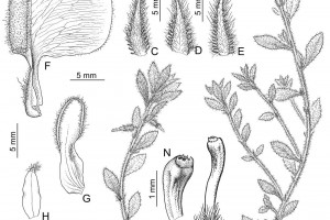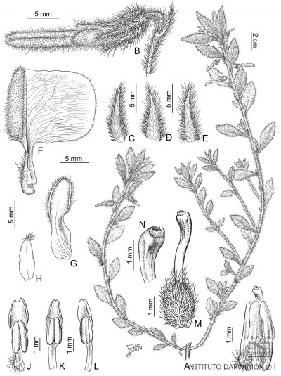 Sufrútices de 20-70 cm de alto, ramificados, notablemente tomentosos a vellosos, de caule leñoso. Hojas alternas; pecíolos de 1-5 mm de largo; láminas elípticas a lanceoladas, oblongas u ovadas, base obtusa, ápice acuminado, margen aserrado. Flores lilas a violáceas, con una mácula amarilla en la base del labelo, solitarias, axilares; pedúnculo de 1-1,3 cm de largo; sépalos subiguales, lanceolados a ovados, de 3-7 mm de largo; pétalos superiores oblongos, lanceolados, subfalcados, de 5-9 mm de largo; pétalos laterales lineares, oblongos, falcados, de 10-15 × 2-4 mm; labelo unguiculado con la base obtusa, la lámina trapezoidal a suborbicular, notablemente extendida, más ancha que larga, con el ápice truncado, de 4-18 × 12-30 mm; estambres desiguales con filamentos de 1,5-3 mm de largo, anteras de 1-2 mm de largo, los 2 estambres inferiores con apéndices nectaríferos en forma de gancho y densamente vellosos; ovario ovoide, tomentoso a velloso; estilo de 4-6 mm de largo; estigma con una lámina saliente y membranácea. Cápsulas ovoides, de 7-8 mm de largo. Semillas ovoides de 2-3 mm de largo.