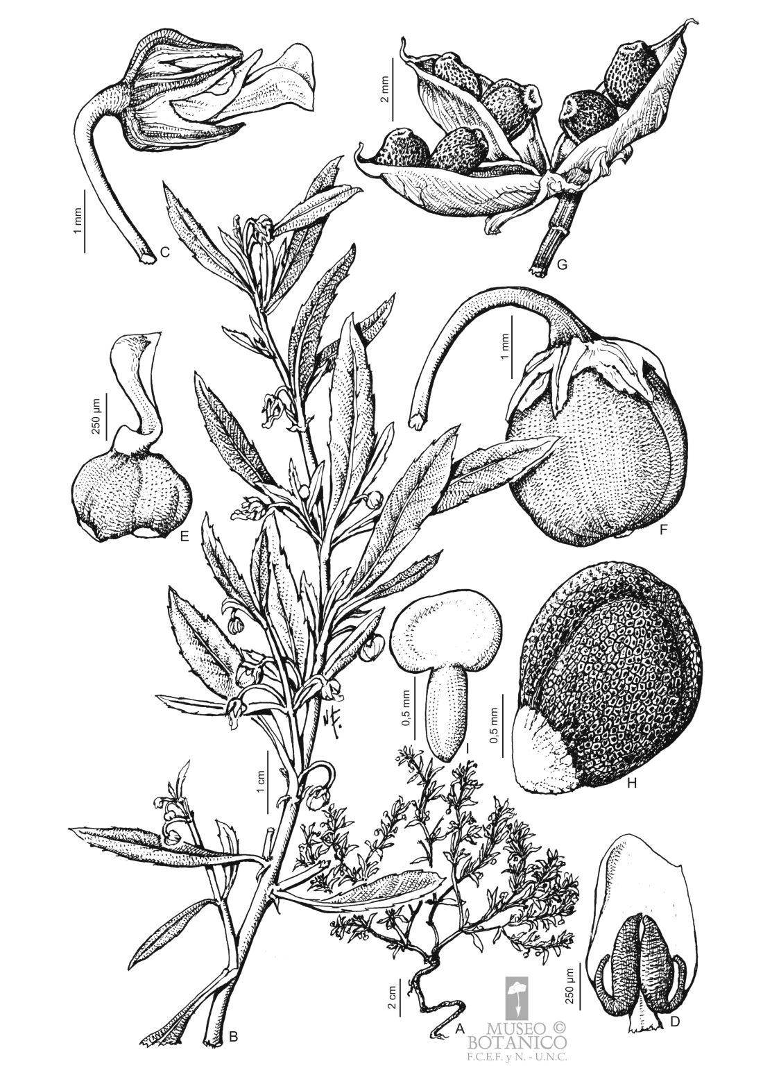 A. Hábito. B. Rama. C. Flor, vista lateral. D. Estambre. E. Gineceo. F. Fruto indehiscente. G. Fruto dehiscente. H. Semilla. I. Embrión.