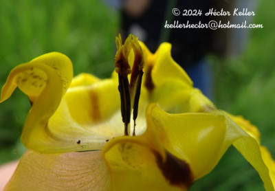 Planta de 50-120 cm de alt. Bulbo subgloboso de 20-30 × 20-30 mm, cubierto por túnicas parduscas. Hojas basales 1-2 al momento de la floración, lineares, 32-58 × 0,2-0,6 cm. Tallo floral muy ramoso. Espatas sustentadas por largos pedúnculos, unifloras, bráctea inferior de 19-25 mm de largo, la superior de 22-40 mm de largo. Flor de color blanco-crema o amarillo, casi sin manchas. Ovario oblongo 7,5-8 × 2-3 mm. Tépalos externos panduriformes de 36-40 × 15-18 mm, inferiormente cóncavo por 13-16 mm; lámina con una línea oscura en la base con pelitos glandulares. Tépalos internos de 15-20 × 13-15 mm; unguículos blanco-crema o amarillo claro, translúcidos anchamente cuneados; lámina geniculado-recurvada, de bordes revolutos, amarillos sin manchas o con escasos puntitos más oscuros, con una depresión profunda, densamente cubierta por elaióforos. Filamentos libres, amarillentos, con base ensanchada, con manchas purpuro-oscuras, de 3-4 mm de largo. Anteras oblongas de 7,5-8,5 mm de largo lóculos y polen pardo-negruzcos. Estilo de 6-7 mm de largo, con ramas de 5-6 mm de largo, concrescentes en la mitad basal, extendidas hacia arriba; crestas 3, la abaxial triangular-ovalada de 1,5 mm de largo, de ápice algo crenulado, las adaxiales algo falcadas, de 4-5 mm de largo; repliegues estigmáticos pequeños, recurvados, pelos se extendiendo hasta la base de las crestas. Cápsula oblonga, de 16-22 × 7-9 mm. Semillas amarillentas o anaranjadas, cónicas, ca. 2,5 mm.