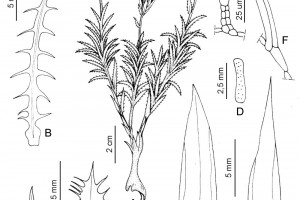 A. Planta. B. Hoja. C. Filarios. D. Aquenio. E. Pelo glandular del aquenio. F. Pelo gemelo no glandular del aquenio. Tomado de Bol. Soc. Argent. Bot. 47: 232, fig. 30. 2012.