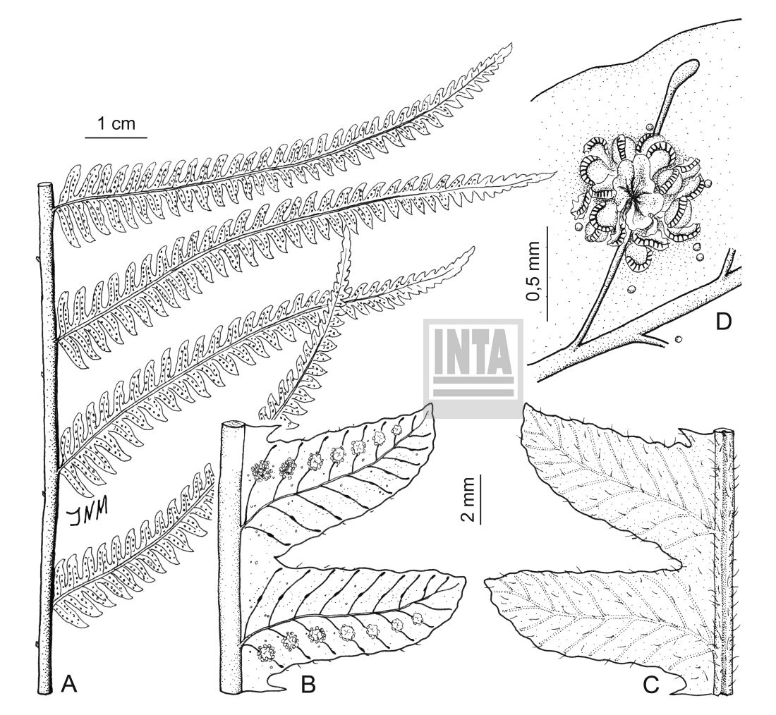 Rizomas erectos, hasta de 7 cm de diámetro (cáudice), con escamas castañas, ovadas u ovado-lanceoladas, glabras. Frondes polísticas, de 0,70- 2,10(2,50) m de largo; pecíolos pajizos, 1/8-1/6 del largo total de la fronde, de 2-6 mm de diámetro, con pocas escamas adpresas; láminas de contorno elíptico-lanceolado, de 15-40 cm de ancho, cartáceas a subcoriáceas, con (3-)4-10 pares de pinnas basales gradual o subabruptamente reducidas; raquis pajizos, adaxialmente pilosos; pinnas lineares, oblicuas y con el extremo atenuado, de 1,5-2,5 cm de ancho; costas adaxialmente con pelos arqueados o crespos, antrorsos, de 0,1-0,4 mm de largo; abaxialmente con pocas escamas angostas, adpresas; segmentos triangulares o lineares, oblicuos o subfalcados, con ápice agudo, los basiscópicos proximales mayores; márgenes enteros o subcrenados, a veces setosos, con 8-12 pares de venas; cóstulas y venas adaxiales con pelos arqueados y antrorsos, como los de raquis y costas, cara abaxial glabra o con pelos glandulares, globosos, sésiles, anaranjados. Aeróforos mameliformes o liguliformes en la base de las pinnas. Soros circulares, medianos o submedianos, indusios reniformes, a veces «subathyrioides», con glándulas anaranjadas y/o con pocos pelos cortos.