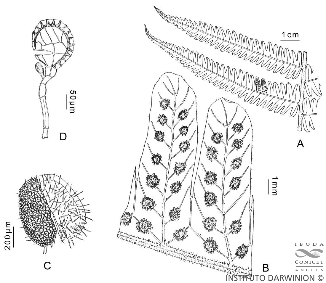 Rizomas corta o largamente rastreros, con escamas castañas, linear o triangular-lanceoladas, setosas. Frondes subdimórficas, polísticas, de 0,50-1,50 m de largo; pecíolos castaños o castañopurpúreos, 1/3-1/2 de la longitud total de la fronde, de 2-6 mm de diámetro, escamosos en la base, densamente pubescentes o glabrescentes; láminas de contorno subtriangular o elíptico, de 15-30 cm de ancho, papiráceas a subcoriáceas; raquis densamente pubescentes; pinnas linear-triangulares, agudas o atenuadas en el extremo, de 7-17 × 1,3-2 cm, con 2-4 pares basales reducidos, en general con los segmentos basales acroscópicos elongadolobulados, costas densamente pubescentes, con pelos de longitud uniforme, de 0,1-0,2 mm de largo; segmentos linear-triangulares, oblicuos, con 6-10 pares de venas, el par basal unido en ángulo obtuso formando una venilla excurrente al seno, de 2-3,5 mm de largo, cara adaxial con pelos aciculares sobre las cóstulas y venas, cara abaxial con pelos setiformes sobre las cóstulas, venas y tejido foliar. Soros circulares, medios, con indusios reniformes, densamente pilosos, pelos muy cortos similares a los de la lámina, esporangios con 1 pelo glanduliforme en el pie. Esporas castañas, plegado-foraminadas, los pliegues anchos y romos.