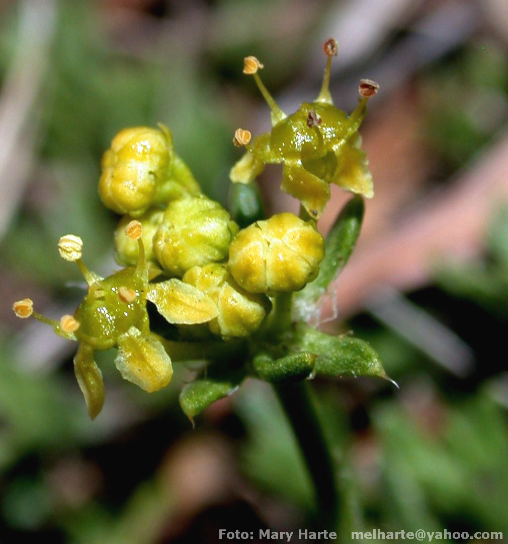 Subarbustos andromonoicos formando matas de 5-15 cm de alto y 10-30 cm de diámetro, bajas, irregulares, laxas; ramas viejas cubiertas por restos foliares persistentes. Hojas pecioladas, de (9)11-14(15) mm de largo, coriáceas; lámina de (3-)4(-5) × 6-8(-9) mm, 3-secta, con el segmento central de (3-)3,5-4,5(-6) × (1,2-)1,4-2(-2,3) mm; segmentos de angostamente obovados a obovados, planos, con margen entero, los laterales de 2-partidos a 3-fidos, raro enteros, glabros, todos articulados en su inserción, articulación a menudo ciliada, con ápice redondeado, terminado en un cilio largo blanco, caedizo, no punzante; pecíolos de (2-)3-6(-7) mm de largo; base foliar amplexicaule, membranácea, con margen ciliado, sin estípulas. Umbelas que sobrepasan ampliamente el nivel de las hojas, con 2-34 flores perfectas o 10-26 flores estaminadas; pedúnculos (11-)19-30(-39) mm de largo, glabros o a menudo con cilias largas y finas esparcidas irregularmente; involucro de (4-)5-7(-8) brácteas de 3-4(-5) mm, margen entero o a menudo 2- o 3-lobado, ciliado o sin cilias, connadas solo en la base, densamente lanoso en el interior. Flores amarillas; cáliz reducido a dientes triangulares; pétalos espatulados, marcadamente angostos en la base, de 1,5-3 × 1,2-1,8 mm; pedicelos de (2,5-)3-4,8(-5,5) mm de largo, ciliados en la base. Frutos alados, de contorno anchamente elíptico a circular, de 3-6(7,5) × 3-6(7,5) mm, muy comprimido dorsalmente; alas del mismo ancho o más angostas que el cuerpo del fruto, paralelas. Carpóforo libre, entero o cortamente 2-fido.