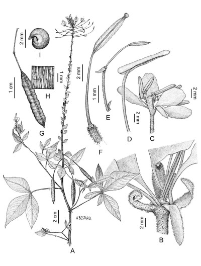 Hierbas o arbustos de 1 m de alto; ramas glandular-pubescentes, pubescentes a glabrescentes. Hojas con pecíolos de 3,5-13 cm de largo, pubescentes a glabrescentes, armados con espinas cortas, rectas, delgadas a robustas; espinas estipulares de 2-3 × 1,5 mm, ligeramente curvadas en el ápice; peciólulos de 4-7 mm de largo, armados, pubescentes; láminas 3-7 folioladas, folíolos elípticos a ampliamente elípticos, elípticos-lanceolados, de 5,2-14,5 × 2,3-5,7 cm, basalmente atenuados a cuneados, apicalmente acuminados a largamente acuminados, margen sinuoso-ciliado a serrulado-ciliado, ambas caras glabras o raramente con tricomas eglandulares, cortos, puntiagudos y dispersos, nervadura central y venas secundarias glabras, con espinas. Inflorescencia en racimos corimbiformes, de 30 cm de largo, terminales; brácteas con pecíolos de 2-8 mm de largo, puberulentos y lámina ovada, de 12-30 × 5-17 mm, basalmente redondeada, apicalmente acuminada, margen serrulado-ciliado, glabro. Flores con pedicelos de 10-20 mm de largo, glabrescentes; sépalos linear-triangulares a lanceolados, de 1,5-2 × 0,5-1 mm, agudos a acuminados, margen ciliado, glabrescentes abaxialmente; pétalos oblanceolados, de 3-4 × 1,5 mm, basalmente contraídos en una garra de 0,5-1 mm de largo, apicalmente obtusos, glabrescentes a glabros, blancos a rosado-intenso; nectario disciforme, conspicuamente carnoso, persistente en el fruto; filamentos estaminales de 10-16 mm de largo, morados, anteras de 2-3 mm de largo; ovario cilíndrico, de 3-5 mm de largo, puberulento; estilo de 1 mm de largo, estigma marcadamente capitado, subsésil. Frutos cilíndricos, de 4,7-8 cm × 3-5 mm, ligeramente torulosos, pubescentes a glabros; ginóforo de 0,5-1,5 cm de largo. Semillas suborbiculares, de 1,5 2,2 × 1 mm, aparentemente lisas, longitudinalmente estriadas y finamente estriadas transversalmente, hendiduras cubiertas por una membrana delgada y opaca.