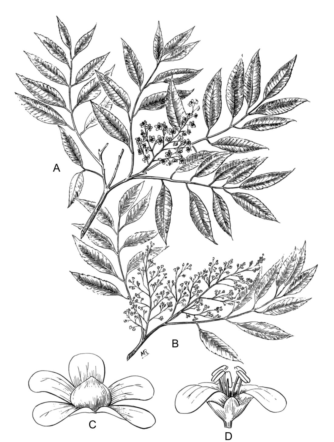 Árboles de 6-25 m de alto; ramas grisáceas a pardo-grisáceas, glabras. Hojas de 10-17 cm de largo; pecíolos de 2-4 cm de largo; folíolos con peciólulos glabros, de 3-12 mm de largo; lámina discolora, angostamente elíptica a lanceolada, de 3-8 × 1-2 cm, ápice acuminado, base cuneada, generalmente asimétrica, margen aserrado, glabra en ambas caras. Inflorescencias en panículas hasta de 15 cm de largo, terminales, glabras. Flores con pedicelo de 1-1,5 mm de largo. Flores estaminadas con lóbulos del cáliz suborbiculares, ca. 1,5 × 0,7-1 mm, glabros; pétalos ovado-oblongos, ca. 2,5 × 1-1,2 mm, blancos. Flores pistiladas con lóbulos del cáliz obovados, ca. 1 × 0,3-0,5 mm, glabros; pétalos ca. 2 × 0,8-1 mm, blancos. Drupa de 2,5-4 mm de diámetro; sépalos fructíferos de 4-5 mm de largo. Semilla amarillo-anaranjada.
