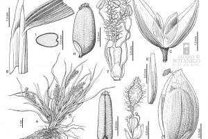 A. Planta. B. Lígula. C. Espiguilla. D. Antecio basal con cariopsis madura. E. Pálea del antecio basal. F. Flor perfecta del antecio basal con lodículas en la base. G. Flor pistilada del antecio distal con 3 estaminodios. H-J. Cariopsis en transporte, vistas lateral e hilar respectivamente.