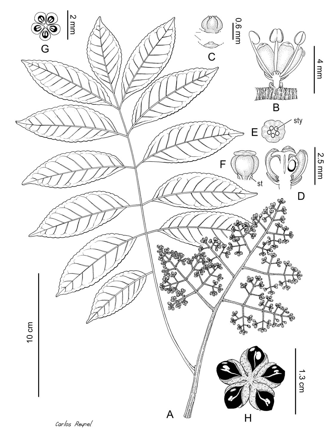 Árboles dioicos, de (5-)6-16(-20) m de alto, glabros; tronco de 20-50 cm de diámetro, espinas usualmente presentes en el tronco y las ramas; corteza gris, extremos de las ramitas profundamente rugosas longitudinalmente, de color gris castaño claro, muchas veces provistos de espinas espaciadas; aromático muy fuerte. Hojas con pecíolos de 4-10 cm de largo, de base poco engrosada, ligeramente achatada en la cara superior; láminas de 12-25 cm de largo, imparipinnadas, con (3-)4(-5) pares de folíolos laterales, opuestos o subopuestos; folíolos elípticos u obovados, de (3-)5-8(-10) × 1,5-3,5 cm, el terminal a menudo más grande, asimétrico, arqueado, papiráceo, base asimétrica, aguda, ápice ligeramente acuminado, margen crenado provisto de glándulas entre los dientes, punteaduras visibles por las dos caras; raquis de (4-)-8-15 cm de largo. Inflorescencia una panícula de 10-12 cm de largo, terminal o axilar; ejes gruesos, transversalmente lenticelados, de color castaño claro. Flores 5-meras; sépalos anchamente ovados, de 1,5-2 mm de largo; pétalos elípticos, de 4-6 mm de largo, blanco-cremosos, caducos; estambres alternipétalos, filamentos de 3-5 mm de largo, anteras ca. 1,5 mm de largo; gineceo de 1,5-2 mm de largo, con 5 carpelos libres; estilo y estigma sobrepasando a los carpelos. Infrutescencias ca. 10-15 × 5-7 cm, densas. Fruto constituido por 3-5 folículos redondeados, ca. 0,5 cm de largo, ligeramente recurvados, con el cáliz persistente, oloroso cuando verde, castaño a la madurez. Semilla castaño-negruzca, brillante.