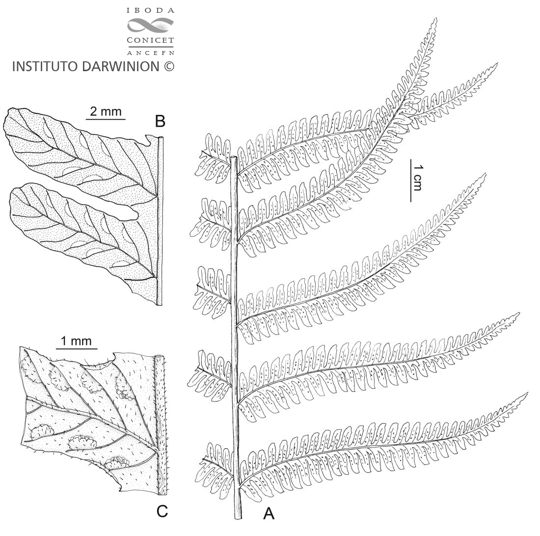 A. Parte media de la lámina. B. Segmentos mostrando venación y posición de los soros. C. Detalle de los soros con indusios.