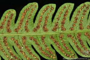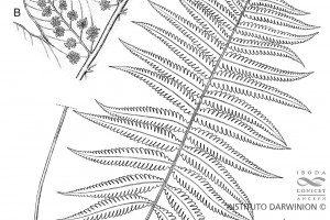 Rizomas rastreros, de 1-2 cm de diámetro, densamente escamosos en el ápice; escamas castaño-rojizas, linearlanceoladas, con pelos ramificados y simples. Frondes polísticas, subdimórficas, de 0,80-1,50 m de largo, las fértiles angostas y de mayor longitud; pecíolos pajizos o castaño-verdoso claros, 0,5- 0,6 veces la longitud total de la fronde, de 2-4 mm de diámetro, con pelos ramificados de pedicelos cortos, en baja densidad o glabros; láminas de contorno subelíptico o angostamente triangular, terminada en una pinna hastada o ápice pinnatífido, láminas fértiles de 12-25 cm de ancho, cartáceas a subcoriáceas, superficie adaxial lisa o frecuentemente escabrosa; raquis pajizo, pilosos en la haz, pelos ramificados rojizos o hialinos, pinnas apicales y medias linear-triangulares, las basales subelípticas, con el extremo agudo o atenuado, sésiles o cortamente pecioluladas, las fértiles de 1-2 cm de ancho, las estériles hasta de 3,5 cm de ancho, el par basal no o levemente reducido, por lo general reflexo, costa con pelos simples, setiformes, con aeróforos visibles en las plantas jóvenes; segmentos triangular-elípticos, subfalcados, agudos u obtusos, de 2,5-4 mm de ancho, margen entero subondulado, formado por una capa externa de células hialinas y una interna de células esclerenquimáticas continua o discontinua, con 8-13 pares de venas, el par basal libre, la vena basiscópica no alcanza el margen o connivente en el seno, apófisis membranoso en el seno, superficie de los segmentos glabra o con escasísimos pelos setiformes en la cóstula y venas del lado adaxial. Yemas prolíferas sobre el raquis y costas del lado adaxial, comúnmente apicales pero también basales. Soros circulares, medios, con indusios diminutos, pilosos, esporangios glabros. Esporas amarillas, crestado-aladas.