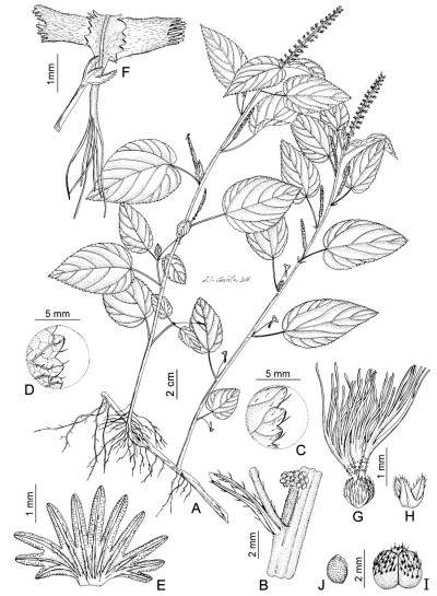 Arbusto o subarbusto rizomatoso, hasta de 50 cm de alto; ramas jóvenes delgadas, pubérulas, con tricomas simples, cortos y curvados; ramas más viejas glabrescentes. Hojas con pecíolo de 2,5-4 cm de largo, con indumento similar al de las ramas jóvenes; estípulas linear-lanceoladas, hasta de 6 mm de largo, hispídulas, caducas; lámina foliar ovado-lanceolada, de (5-)6-8 × (3-)4-5 cm, base redondeada a cordada, ápice agudo a subacuminado, margen aserrado con dientes redondeados o triangulares; cara adaxial y abaxial laxamente pubescentes a glabrescentes, con tricomas simples, adpresos sobre las venas; nerviación pinnatipalmada, con 7 nervios en la base y 5-6 pares de nervios secundarios, membranáceas, con o sin gotas resinosas. Inflorescencias 1-sexuales, espiciformes. Inflorescencias pistiladas hasta de 12 cm de largo, laxifloras, terminales, erectas; pedúnculo de 0,5 cm de largo, pubescente; raquis claramente visible; brácteas hasta de 3,5 × 4,5 mm, acrescentes en el fruto, hispídulas a subglabras, margen con 10-12 dientes lineares, de 1/2 a 2/3 del largo total de la bráctea, obtusos en el ápice, cubiertos por papilas cristalíferas diminutas. Inflorescencias estaminadas hasta de 4,5 cm de largo, axilares; pedúnculo de 8 mm de largo, con pubescencia adpresa; flores densamente aglomeradas; brácteas lineares, de 0,5 mm de largo, ciliado-hispídulas. Flores pistiladas solitarias en cada bráctea, sésiles; sépalos 3, triangulares, de 1 mm de largo, connados en la base, hispídulo-ciliados; ovario de 0,8 mm de diámetro, densamente pubescente; estilos de 5 mm de largo, libres en la base, pilosos en la base, divididos en 12-13 segmentos delgados. Flores alomórficas en el ápice de algunas inflorescencias estaminadas y pistiladas, y también solitarias en las axilas foliares de los nudos basales, sobre pedicelos filiformes ca. 2 cm de largo, con pubescencia esparcida; sépalos 3, irregulares; ovario cilíndrico, de 5 mm de largo, fimbriado en los extremos, finamente pubescente, con estilo único, subbasal. Fruto una cápsula ca. 2 mm de diámetro, pubescente y papilosa. Semillas ovoides, de 1,5 × 1 mm, finamente foveoladas.