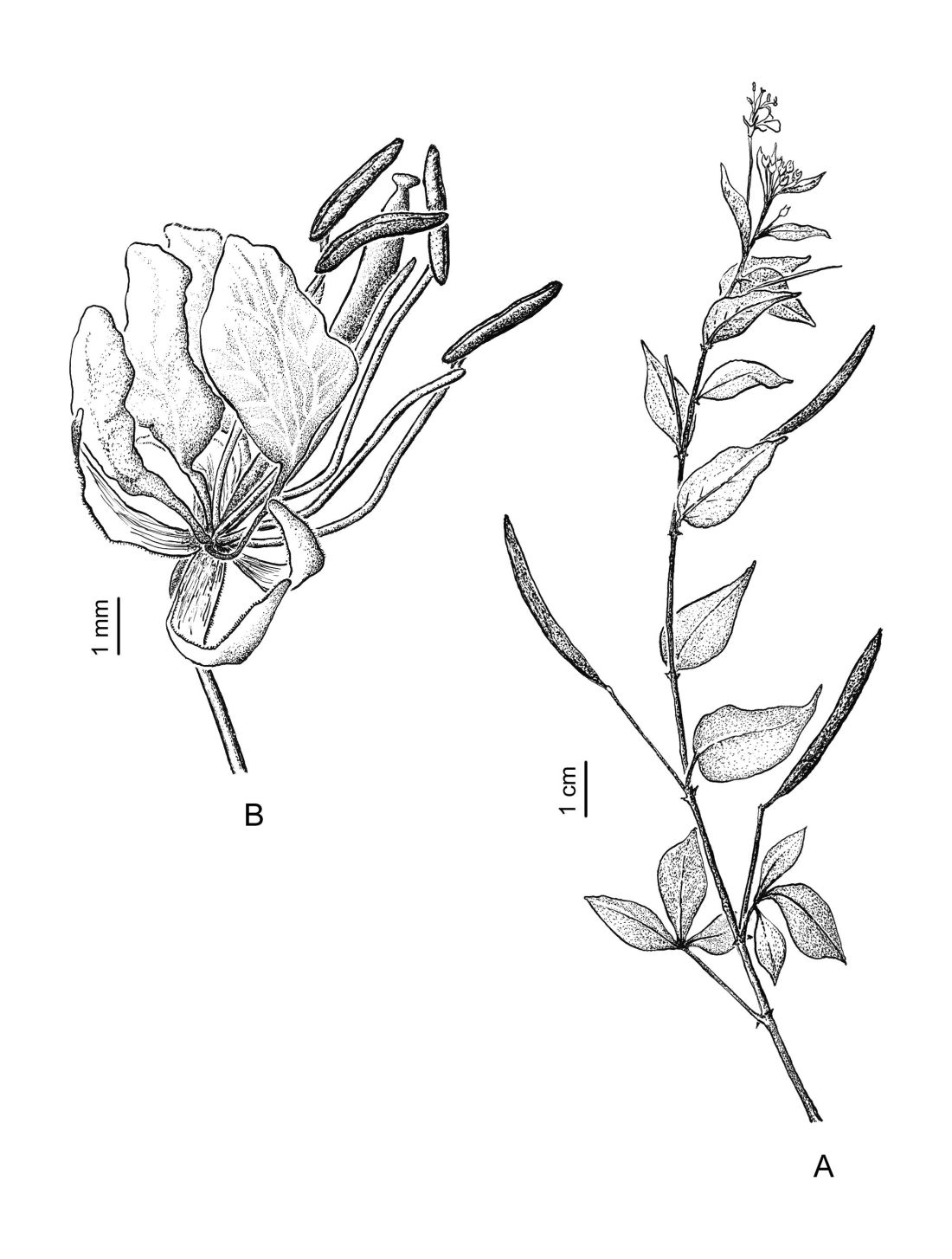 Hierbas de 0,5-0,6 m de alto o subarbustos hasta de más de 1 m de alto; ramas glandular-puberulentas a densamente glandular-puberulentas en todas partes. Hojas con pecíolos de 0,5-2(-3,5) cm de largo, glandular-puberulentos, inermes; espinas estipulares de (0,5-)2-3 × 1,5-2 mm, rectas, ausentes en algunos individuos o muy cortas; láminas 3-folioladas, con folíolos ovados a lanceolados, elípticos a rómbicos, de 1,2-6,3 × 0,6-2,5(-3) cm, base cuneada, ápice agudo a acuminado, margen entero, ciliado, ambas caras con tricomas dispersos, cortos, puntiagudos, eglandulares a glabros, nervadura central y venas secundarias glabras, sin espinas. Inflorescencia en racimos, de 4,5-13 cm de largo, terminal y/o axilar; brácteas con pecíolos de 3-8 mm de largo, puberulentos y con la lámina ovada, de 10-23 × 5-10 mm, base obtusa, ápice agudo, glabrescentes, ciliadas. Flores con pedicelos de 15-28 mm de largo, glabrescentes; sépalos triangulares a lanceolados, de 2,5-3 × 0,5-1 mm, acuminados, abaxialmente puberulentos a glabrescentes, ciliados; pétalos espatulados, de 3,5-5 × 2-2,5 mm, basalmente contraídos en una garra de 1,5-2 mm de largo, ápice redondeado a obtuso, glabros, blancos; nectario disciforme, carnoso, obsoleto en el fruto; filamentos estaminales de 3,5-7 mm de largo, violáceos, anteras de 1-3 mm de largo; ovario cilíndrico, de 3,5-4,5 mm de largo, glabrescente a glabro; estilo ausente, estigma capitado, sésil. Fruto cilíndrico, de 2,2-6,9 × 0,3-0,6 cm, ligeramente toruloso, glabro; ginóforo de 1-10(-20) mm de largo o sin éste. Semillas subcocleares, de 2-2,5 × 1-1,5 mm, longitudinalmente estriadas, crestas transversales cubiertas apicalmente por tricomas simples, hendidura cubierta por una fina membrana; arilo blanco.