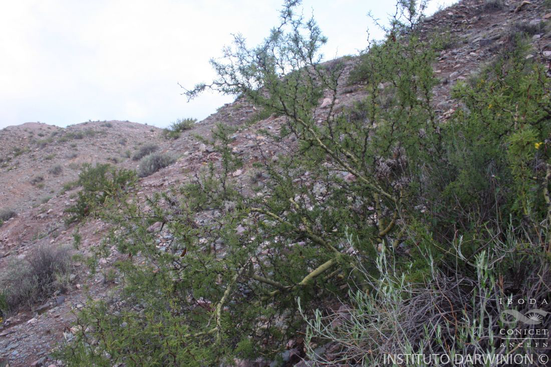 Arbustos, 0,50-2(-3) m alt., a menudo achaparrado y ramas en zig-zag; espinas bi o uninodales por atrofia de una del par, castaño-rojizas, 0,5-3(-6,5) cm long. Hojas aparentemente pinnadas, fasciculadas sobre braquiblastos de ramas adultas; pinnas, 1-2(-3 cm long.; estípulas, deltoides, 1 mm long., castaño-rojizas; folíolos (4-)5-8(-13) pares. elípticos, 1-3 mm long. x 0,5-1 mm lat., distanciados entre sí, pubérulos. Flores, 10-12 mm long. sobre racimos de 1,5-2 cm long., pubérulos a glabros; pedicelos, 5-8(-10) mm long., articulados, pubérulos a glabros; brácteas linear-deltoides, 1-2,5 mm long., tempranamente caducas; hipanto cupuliforme, 1 mm long. x 2,5 mm diám; cáliz de sépalos oblongo-ovados, 5-6 mm long. x 2 mm lat., glabros; pétalos largamente obovado-rómbicos, 11 mm long. x 2-3 mm lat., el adaxial de uña canaliculada; ovario linear, 5 mm long., glabro o laxamente piloso, estipitado, 2-6-ovulado. Legumbre comprimida lateralmente, de contorno elíptico, 3-6 cm long. x 0,8-1 cm lat., estipitada, castaño-rojiza, glabra, nervada, de márgenes paralelos o con constricciones entre las semillas, aguda, subfalcada. Semillas 1-3, compreso-ovoides, aprox. 7 mm long. x 5 mm lat.
