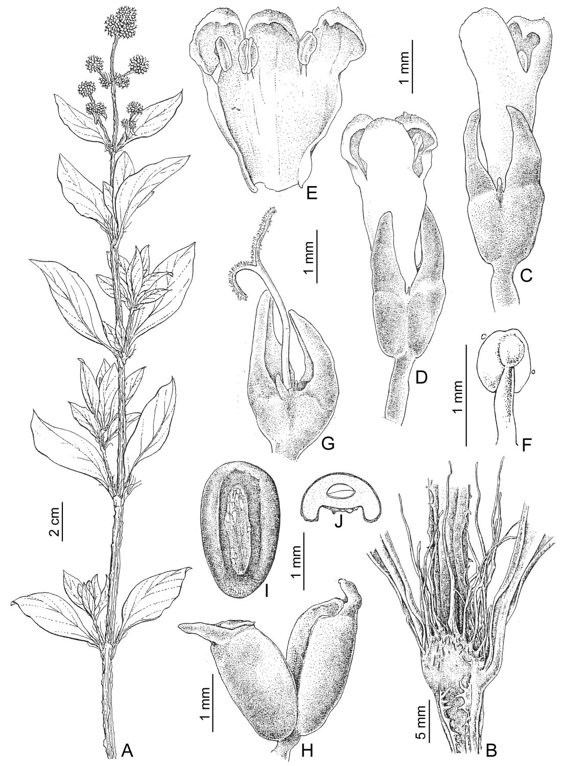 A. Rama florífera. B. Vaina estipular con fimbrias. C-D. Flor. E. Interior de la corola desplegada. F. Antera y glándula. G. Cáliz, estilo y estigma. H. Fruto. I-J. Semilla, cara ventral y corte transversal, respectivamente.