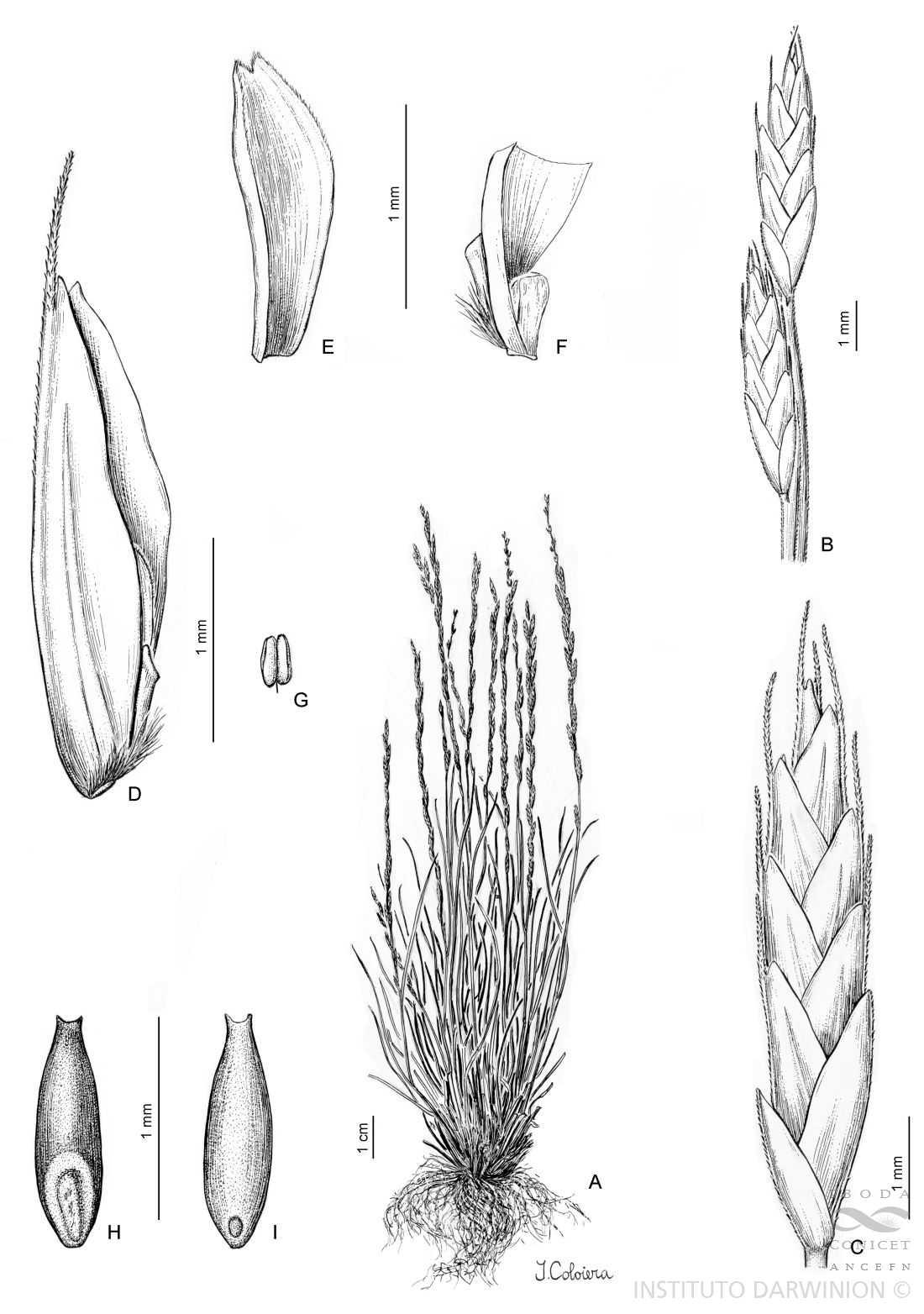 A. Planta. B. Porción del raquis con dos espiguillas. C. Espiguilla. D. Antecio basal. E. Pálea, vista dorsal. F. Base de la pálea, raquilla y lodículas. G. Antera. H. Cariopsis, vista escutelar.I. Cariopsis, vista hilar.